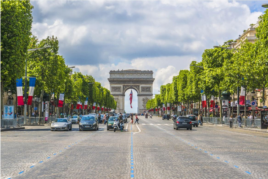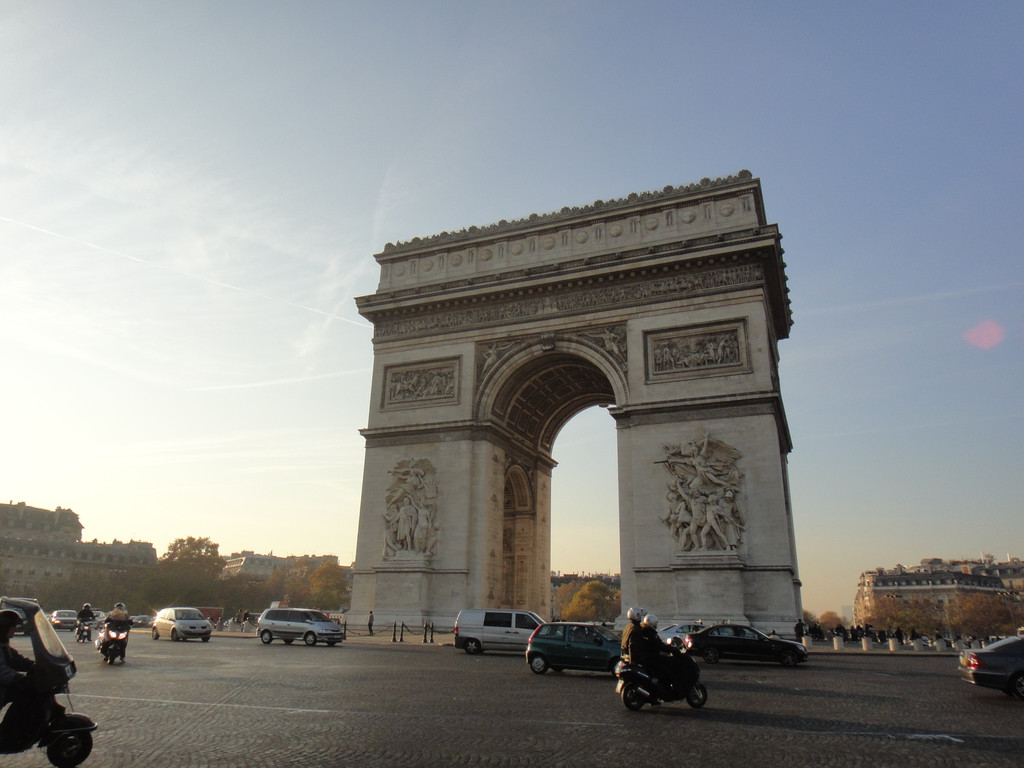 因戴高乐广场是个转盘,而凯旋门实际面向机动车道转盘,很难拍到没有车辆的凯旋门