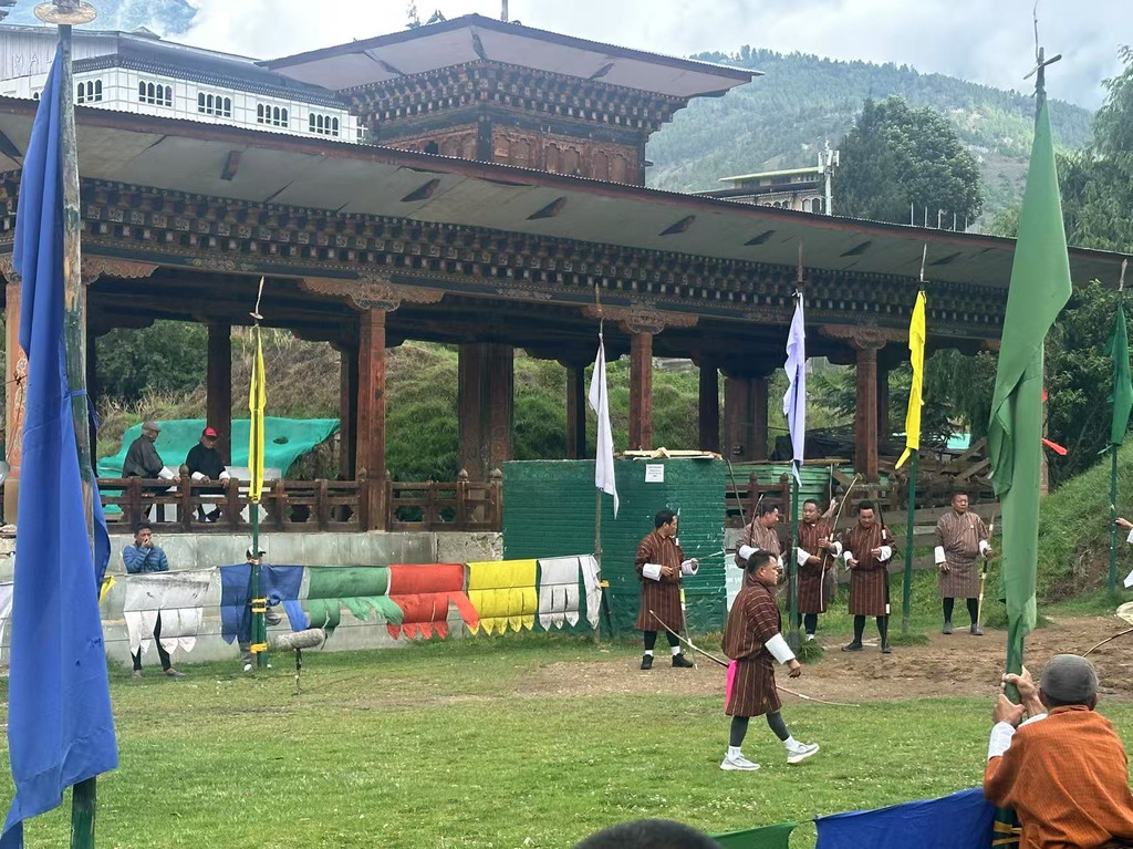 小哥早上8点半到酒店接我们,装上行李。今天是廷布当地射箭比赛的总决赛,导游小哥说要带我们去感受一下不丹最受欢迎的体育运动。不丹传统射箭靶距约140米,两队对抗轮流射击,射中靶子得2分,射中靶心得3分,最先拿到25分者胜利。每次射中队友都会唱歌跳舞庆祝。