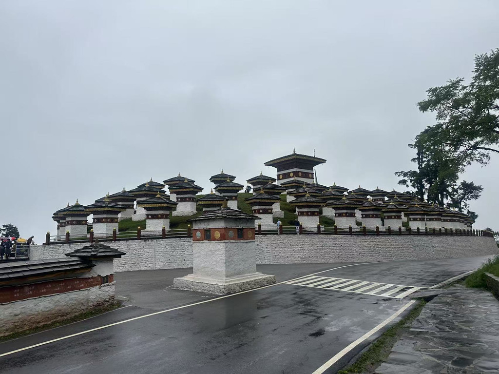 从廷布到普纳卡宗全程大约需要2小时左右。。导游小哥约好早上9点从酒店出发,开车约50分钟就到了海拔3100多米的多楚拉山口。在这里有一个由108座白塔组成的白塔林,是为了纪念2003年不丹国王在这里成功驱逐印度叛军而建的。这里的背面是雪山,在冬天的早上9点到12点在这里能看到,但夏天基本都会因为雨雾天气而无法看到。