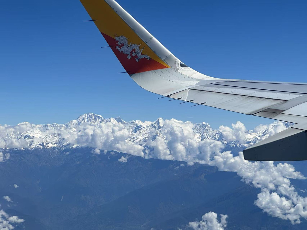 一早登上了去帕罗的航班。起飞大约20分钟后机长就会用英文告诉大家我们正飞过喜玛拉雅山脉,能近距离平视欣赏多座世界高峰,当然包括珠穆朗玛峰(Mount Everest)。这些高峰的英文名大家提前复习一下哈,不然人机长说的你都听不懂。