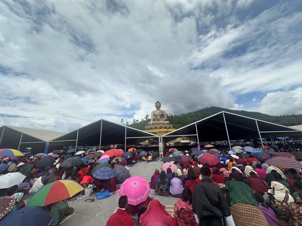 感受完射箭比赛后我们就去参观廷布大佛。廷布大佛建于廷布的一座山上,面朝东方,如果天气好的话看大佛日出会相当壮观。这个月恰逢廷布大佛颂经日,全国各地大约有几万名藏传佛教徒聚集在大佛广场听大师颂经祈福。他们白天在大佛前虔诚听经,晚上就在在大佛旁边的空地上搭上简易帐篷睡觉。寺庙会提供免费的吃食,学校的学生们会帮助寺庙分发食物。听说在颂经会结束后大师会逐个给每一位教徒加持。