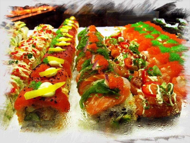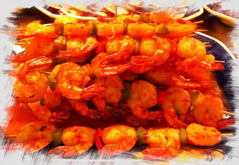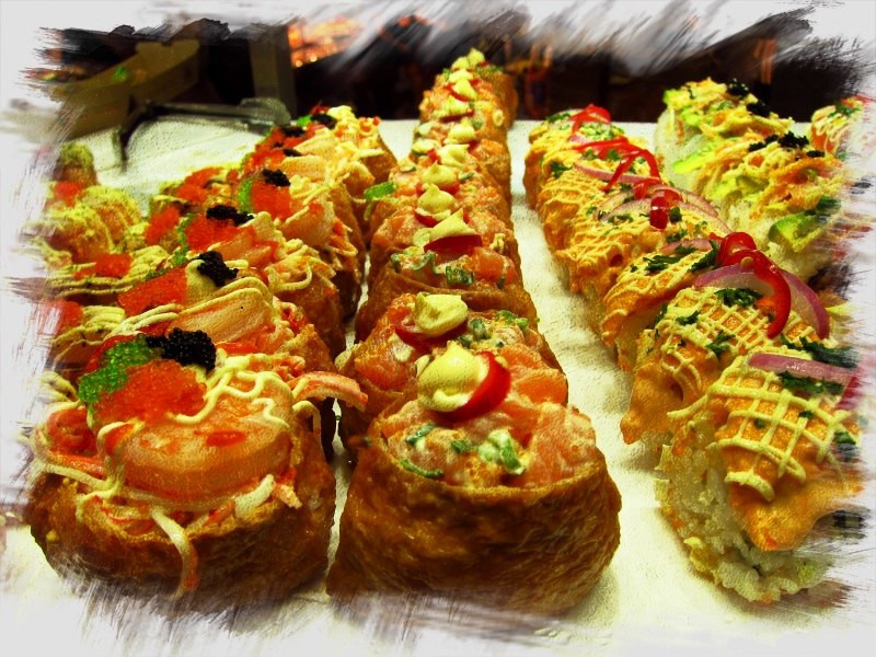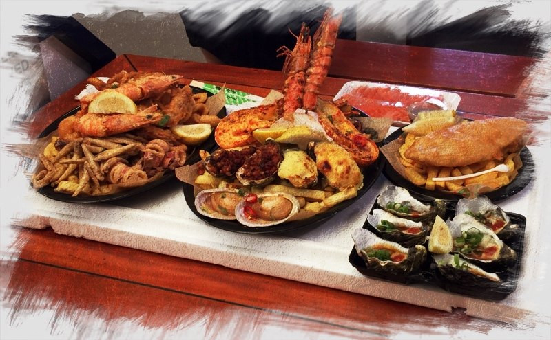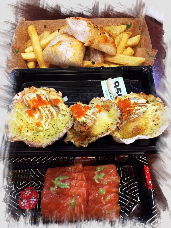 有很多小份的鲜虾拼盘、刺身、炸鱼薯条、各种串、沙拉。