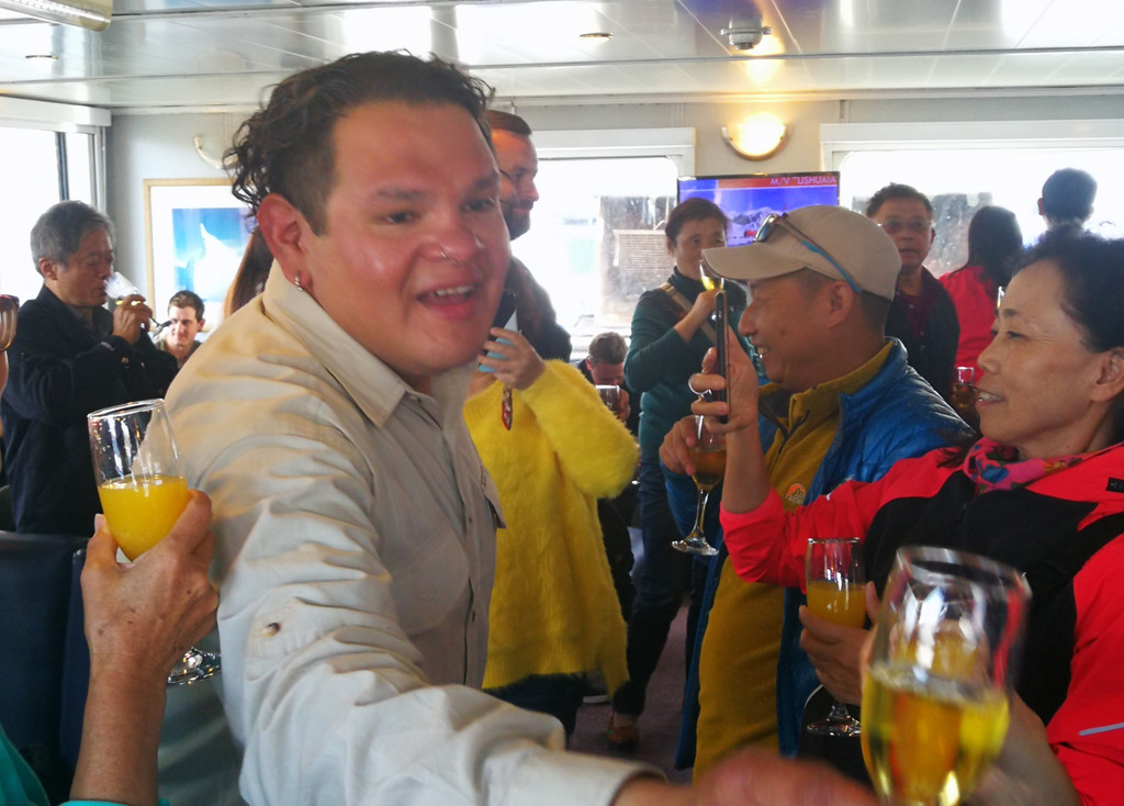 要说给力,我还真的要好好夸夸乌斯怀亚号。这次南极行,在先期考察时就已决定,100人以上的船不考虑,因为船大人多影响登陆次数,最终选定了乌斯怀亚号。实践证明我的选择是正确的,在南极的5天航行中,2次巡游,8次登陆,是同天数在南极登陆最多的一艘船。不管是阴天下雨,还是大风大浪,船长都能按计划措施登陆、巡游,反映出船方的职业道德和认真负责的敬业精神。餐厅服务员每顿饭都要送到每个人的桌前,并一直面带笑容,客房服务员每天多次打扫房间,保证清洁,休息大厅24小时咖啡、热茶供应,随时可以享用,没有任何的收费项目,除了150美元小费,你可以在船上不花1分钱,只有你想不到的,没有他们做不到的,让人感受到在家的温暖。幸苦了船员们,感谢你乌斯怀亚号。
