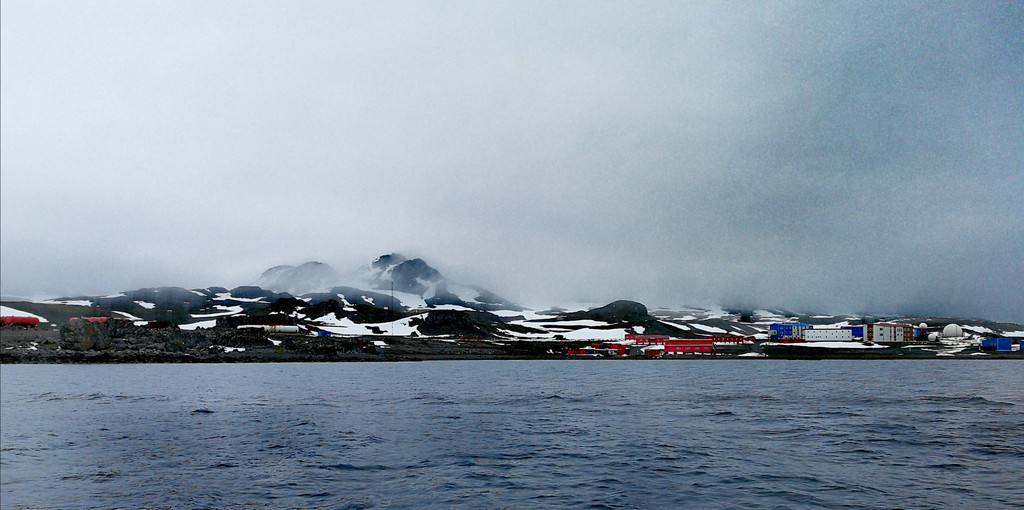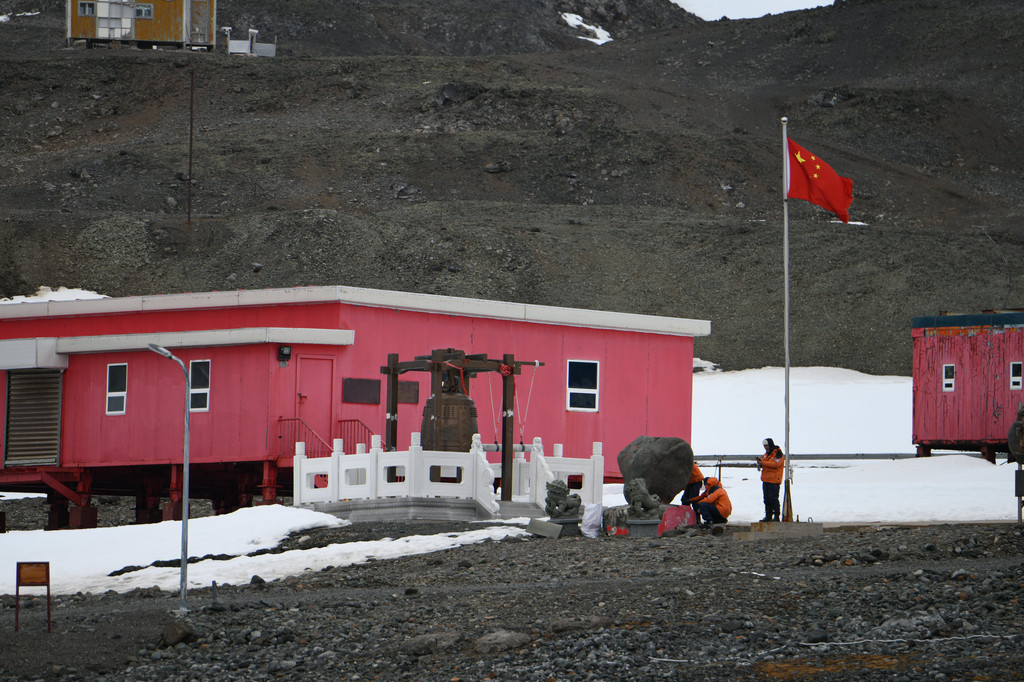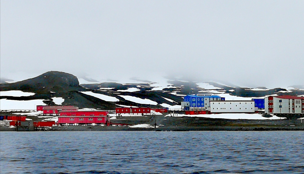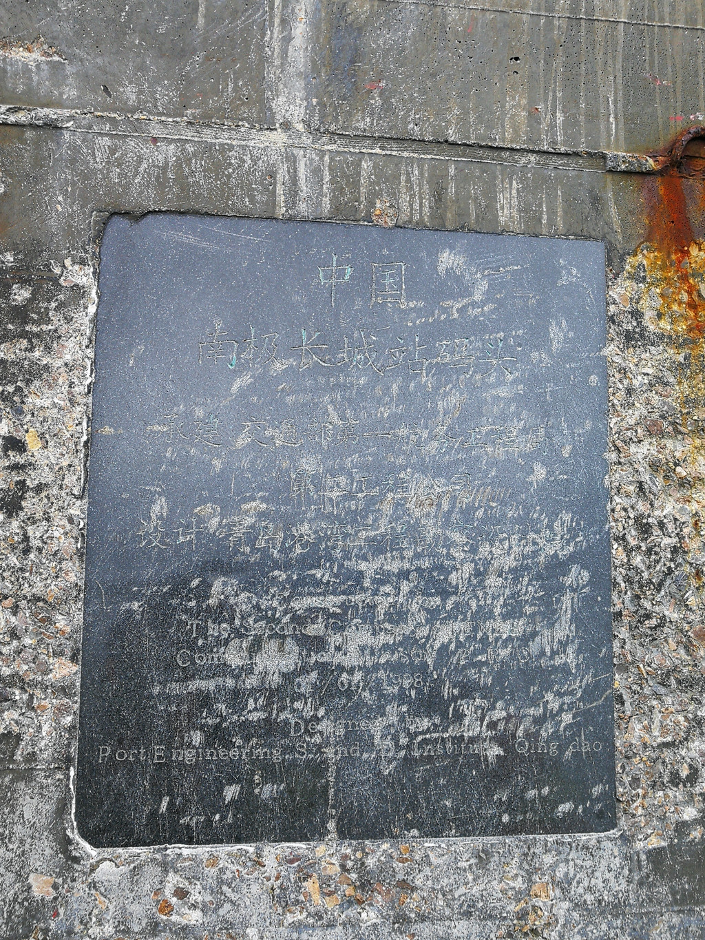 上午,乌斯怀亚号驶入到乔治王岛西南海域的菲尔德斯半岛,中国南极长城站就建在这个岛上。因长城站有重要的科考项目,不能接待游客登岛参观,但可以坐冲锋艇到岸边巡游参观,也算没有白来。长城站建于1985年2月,占地2.5平方公里,终年积雪不化,有各种建筑25座,夏季可容纳60人,冬季可供20人越冬科考。10点钟大家陆续登上冲锋艇,向岸边驶去,到了岸边,长城站尽收眼底,红、白色的建筑很显眼,圆形高大的储油罐一字排开,空场处一个旗杆高高耸立,五星国旗在上端迎风飘扬,岸边的一堵水泥墙上,刻有一块中国长城站的碑文,经多年海水的冲洗,字迹已经不清。从外表看,长城站很气派,环境不错,但在长年寒冷的天气下工作,科考队员一定很辛苦,感谢你们为祖国付出的一切。