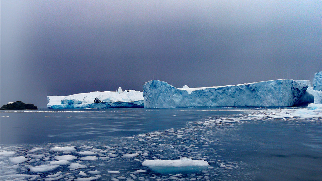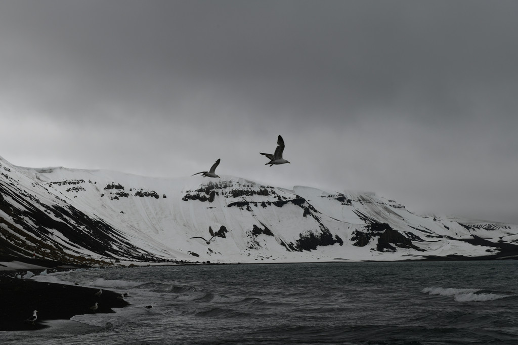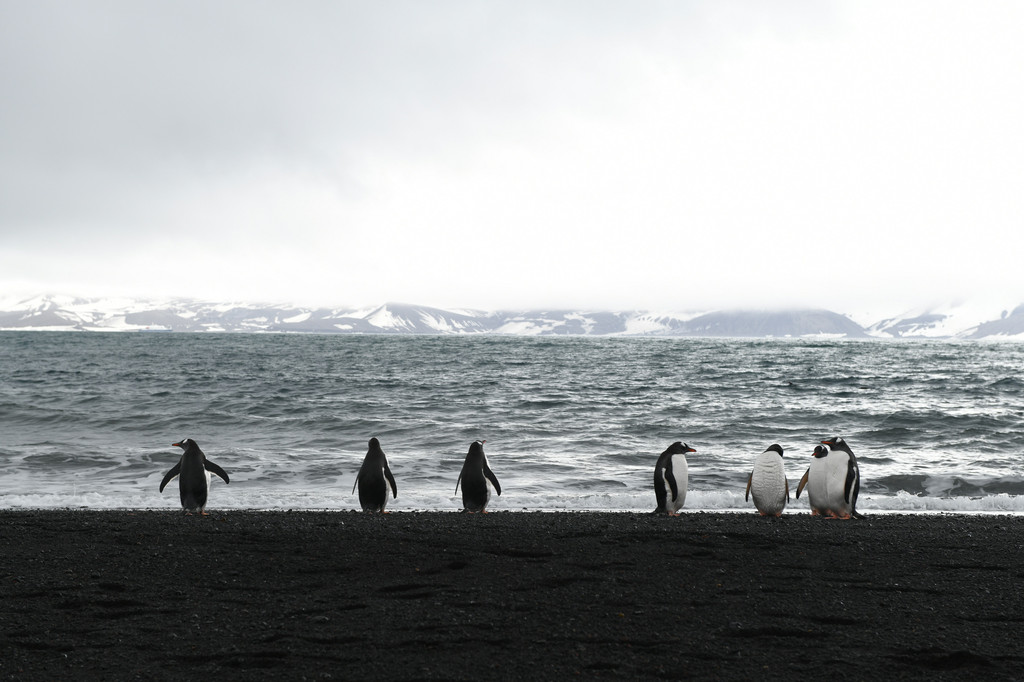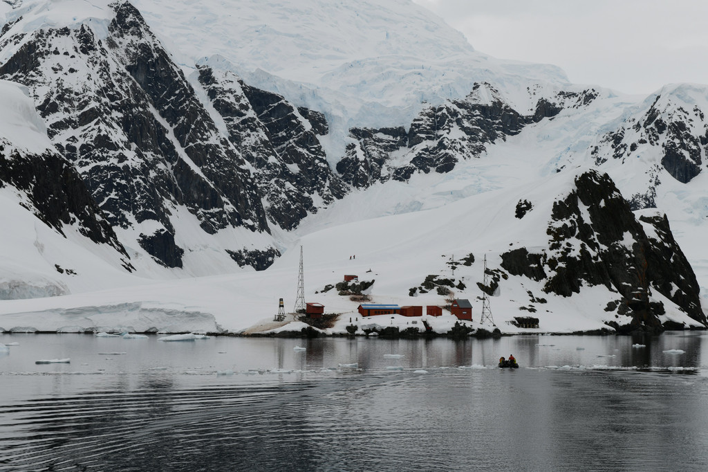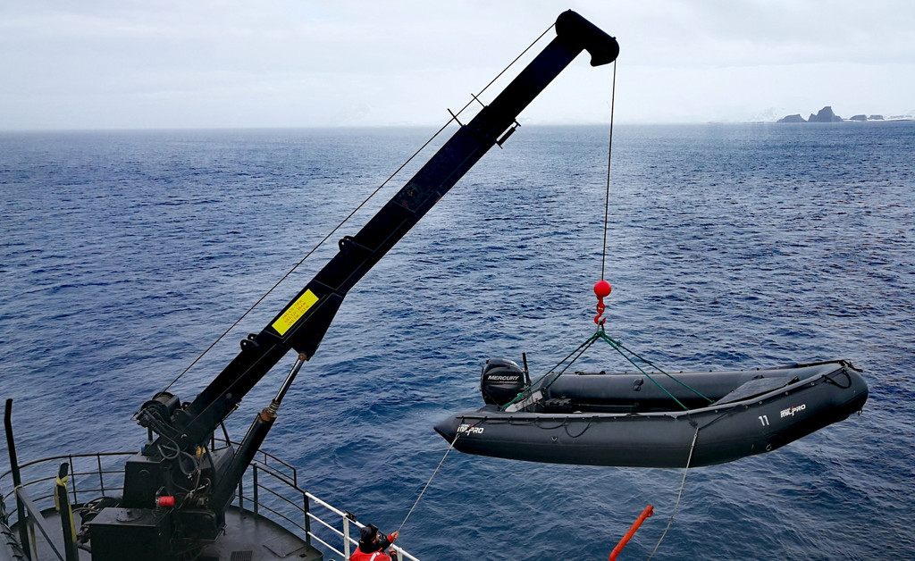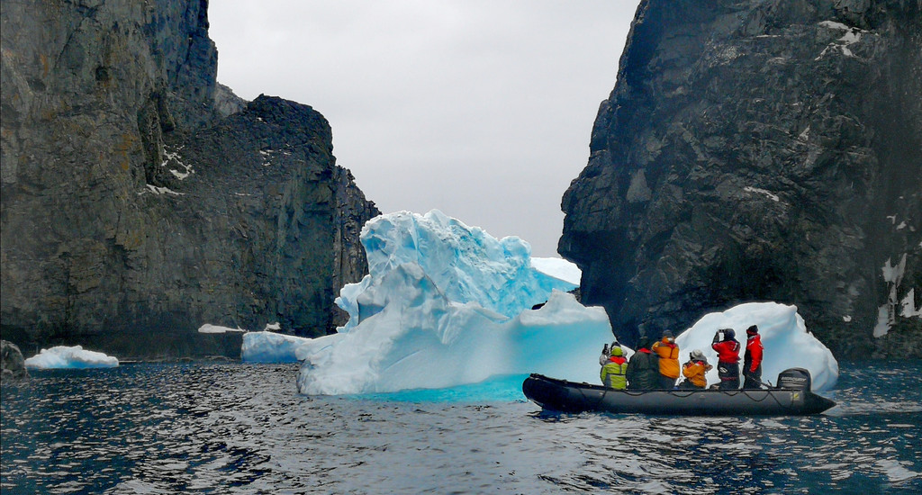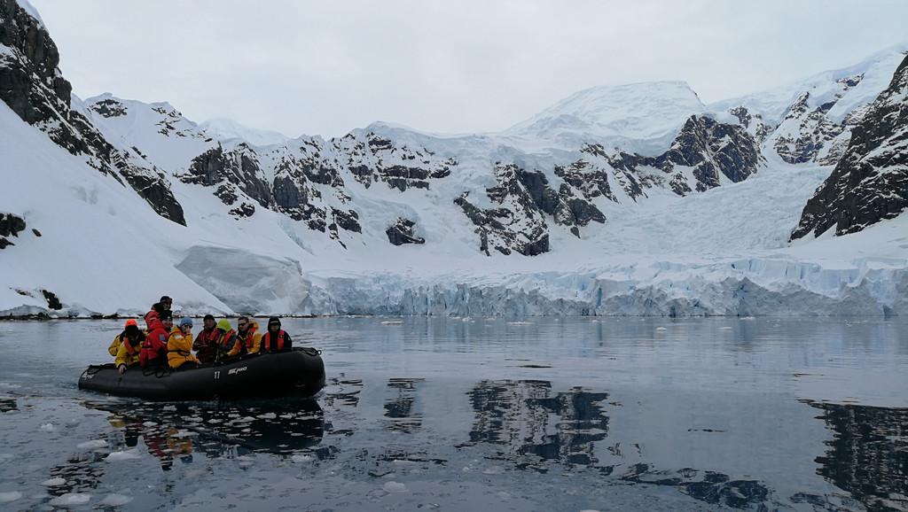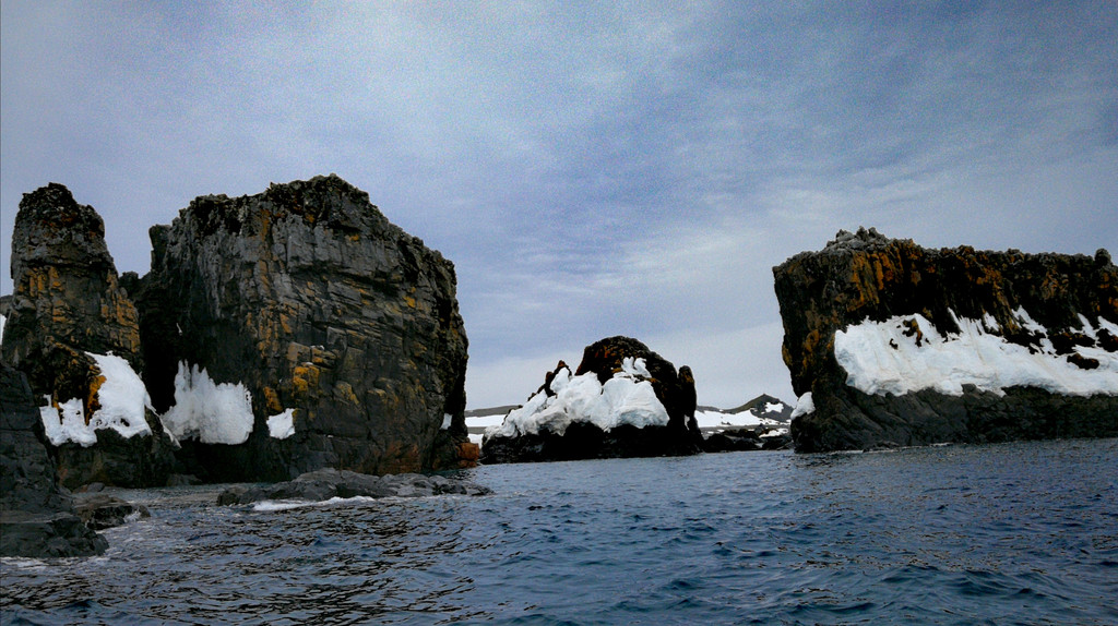 下午3点多钟,乌斯杯亚号穿过了德雷克海峡,周边出现了越来越多冰川覆盖的小岛,渐渐地进入到南极的南设得兰群岛。4点钟船上广播通知,半小时后开始登陆该群岛的巴里恩托斯岛。八艘冲锋艇依次入海,探险队员先行探路,并在岛上插上路标。大家全副武装,单号房间的人员先行,双号房间的人员断后,每艘乘坐8人,冲向岛屿。