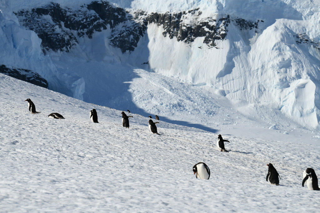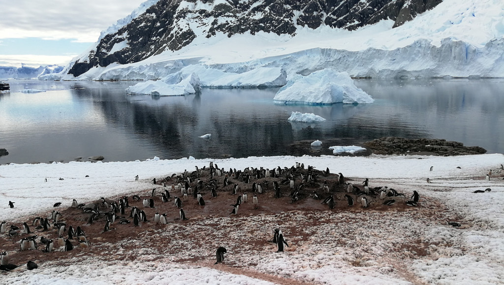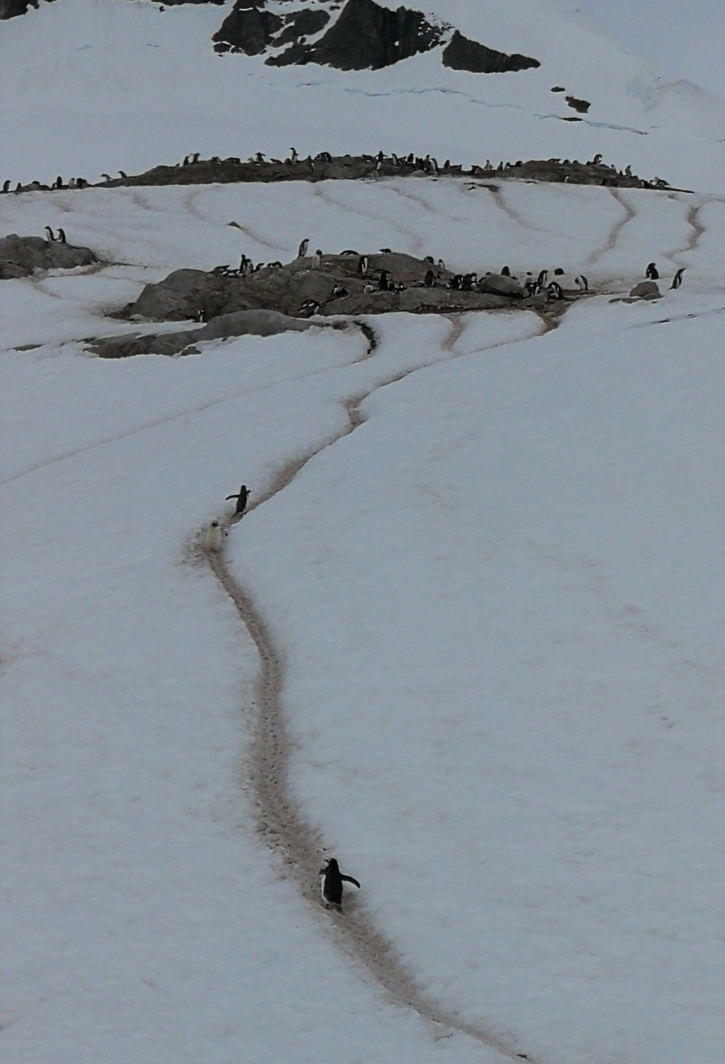 今天我们非常幸运,下午又一次登上了南极半岛的尼克港。尼克港是安德沃得湾深处的一处登陆点,是一个天然海湾,靠近海岸线的冰川前沿,经常有裂开的冰山倾人海中,气势磅礴,崩裂伴随着巨大轰鸣声,非常震撼。海湾被群山和冰川环抱,岛上有大量的金图企鹅在此居住和繁殖,这些企鹅生活很不容易,每天沿着他们的“高速公路"长途跋涉,下海捉鱼捕虾,养家糊口。企鹅对游人毫不畏惧,经常向游人奔来,我们只能停下来,给它们让道。