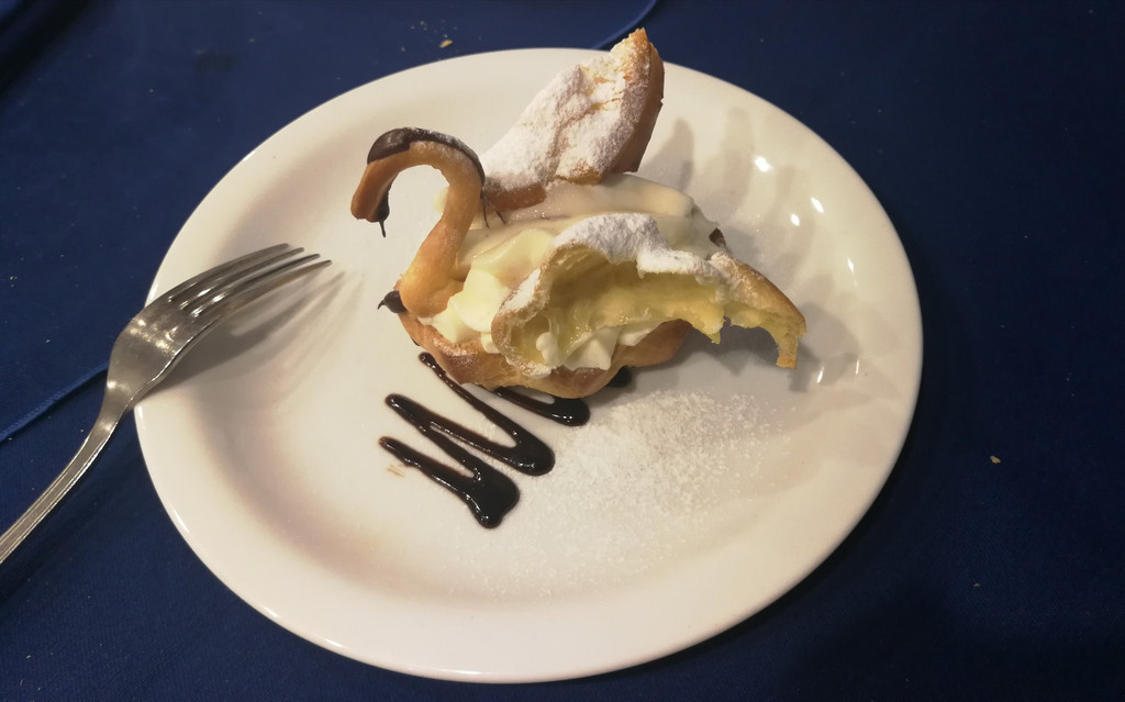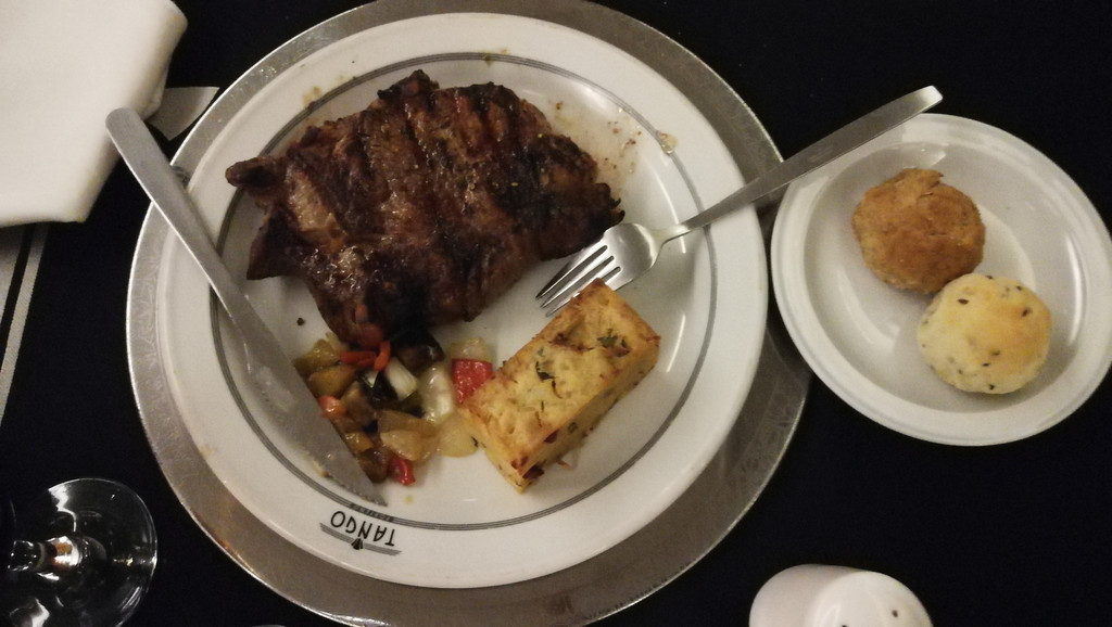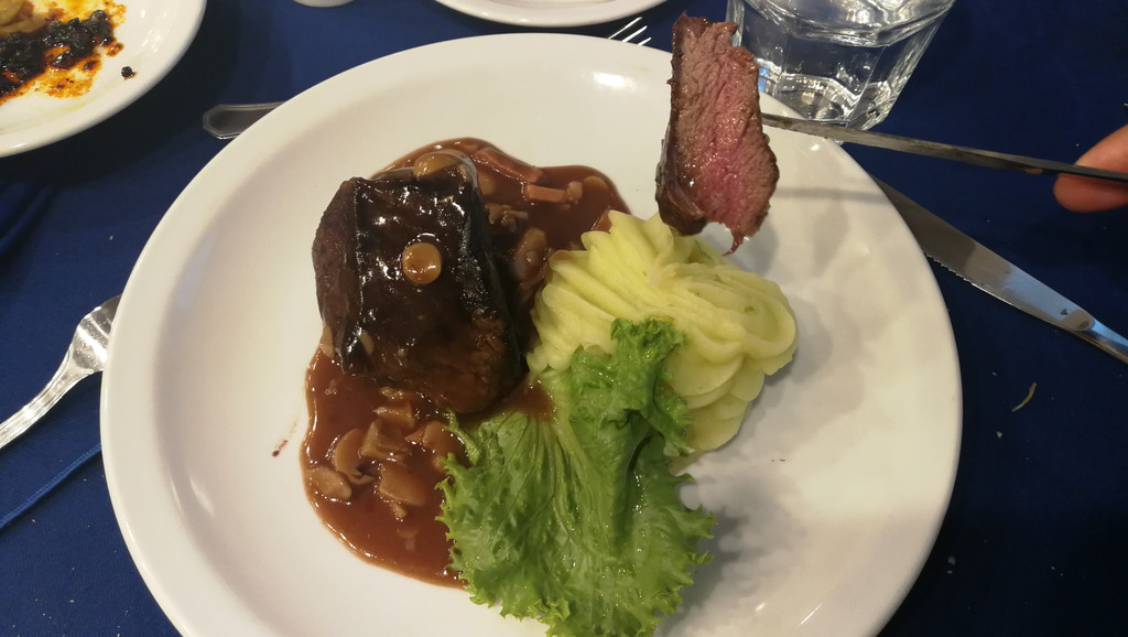 仪式结束后,晚餐时间也到了。告别晚餐是这次船上最丰盛的一顿晚餐,第一道前菜是帝王蟹腿沙拉,第二道主菜是质量极佳、份量极大的一块上等牛排,鲜嫩可口,第三道是一个小天鹅造形的甜点,可爱的让人不忍心吃它,乌斯怀亚号太给力了。