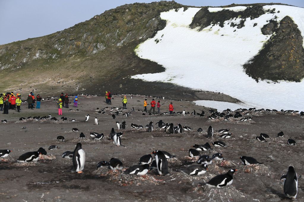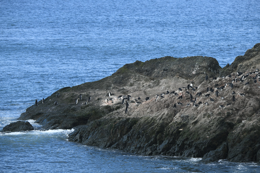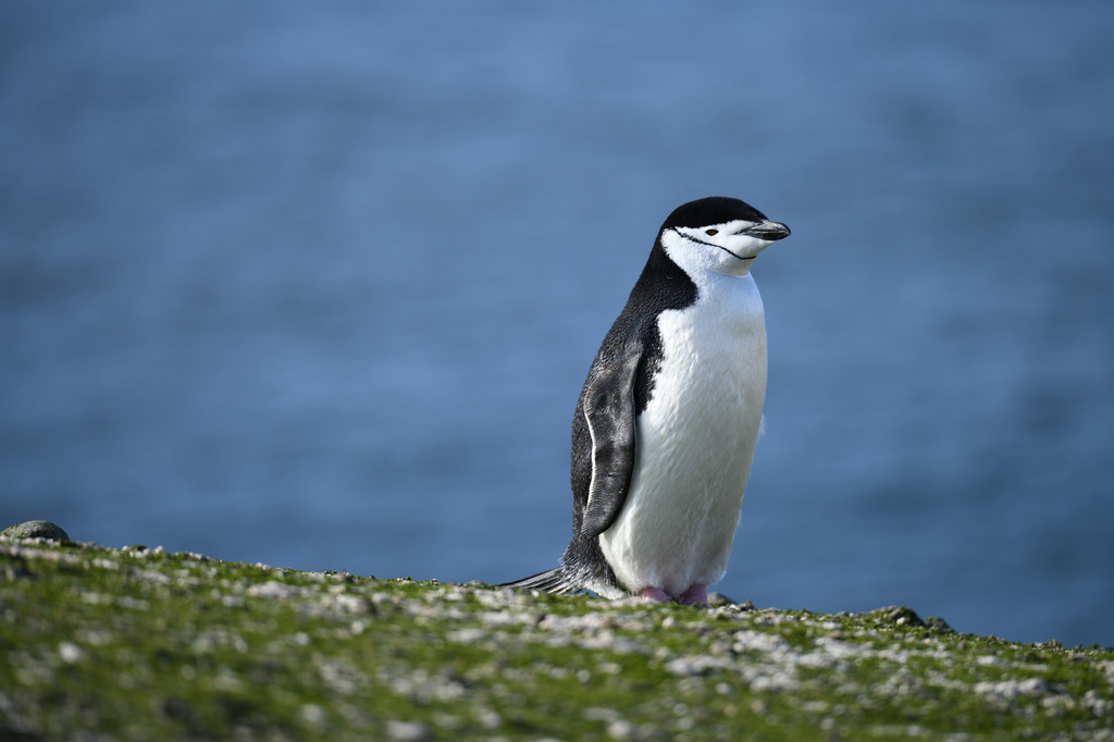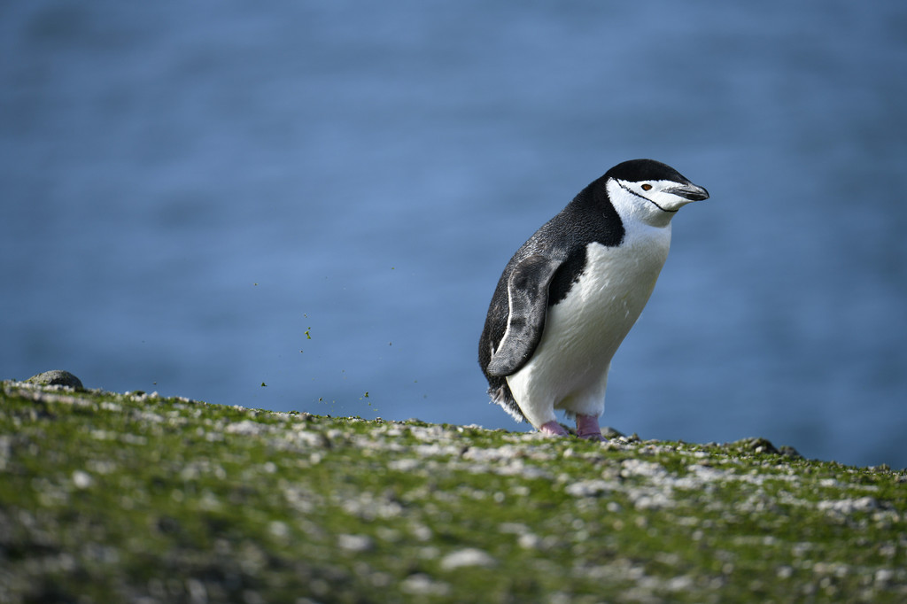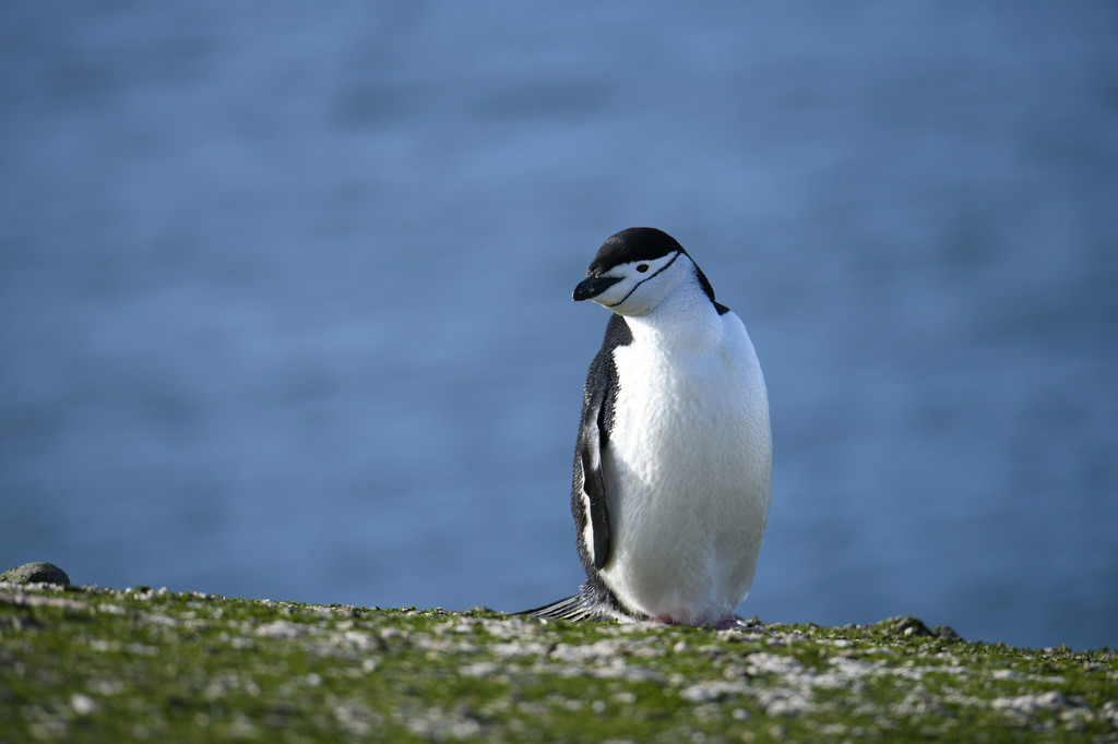该岛面积不大,两座小山披挂着皑皑白雪,坦露的地表长有少量的苔癣和地衣,这是南极唯一可以看到的绿色。这里是帽带企鹅和金图企鹅栖息地,帽带企鹅白色的腹部,油黑的背部,从黑黑的嘴巴下方,到头上的两侧,长有一条黑黑的一条细毛,像似头上带有一个小帽子,黑黑的斗鸡眼里长着一对橙色的眼珠,让人越看越喜欢。金图企鹅腹、背部的染色和帽带企鹅相同,不同的是橙色的嘴巴,橙色的双脚,和头上长有一块雪白的白毛,表情和走路显得非常伸士。企鹅根本不怕游人,常常摇摇晃晃地走到你的面前看看,转身又走向别处。