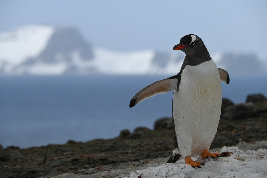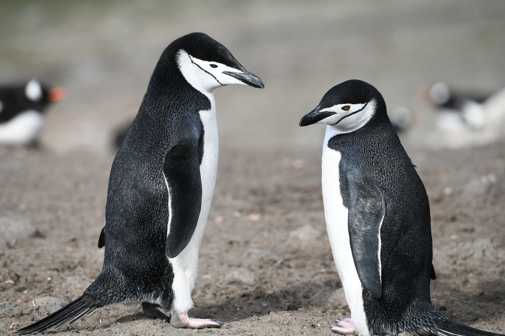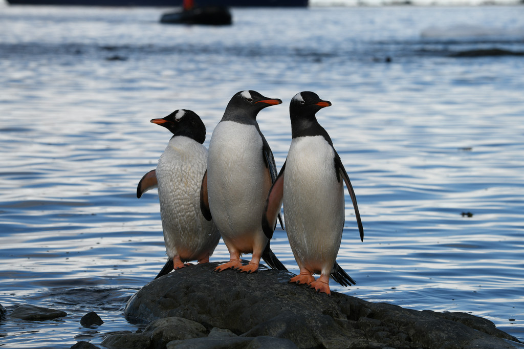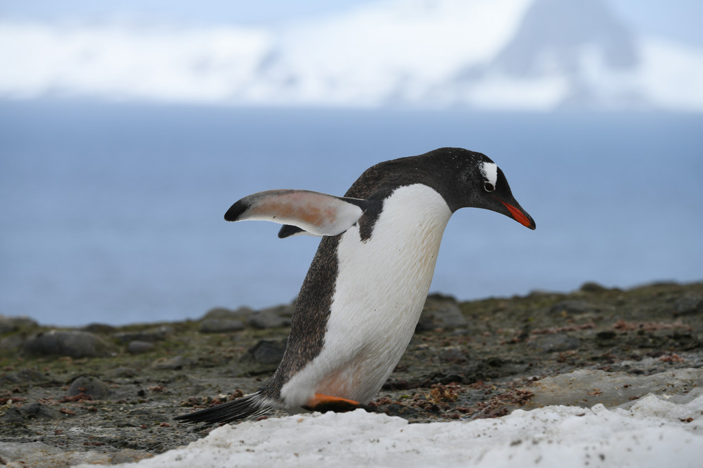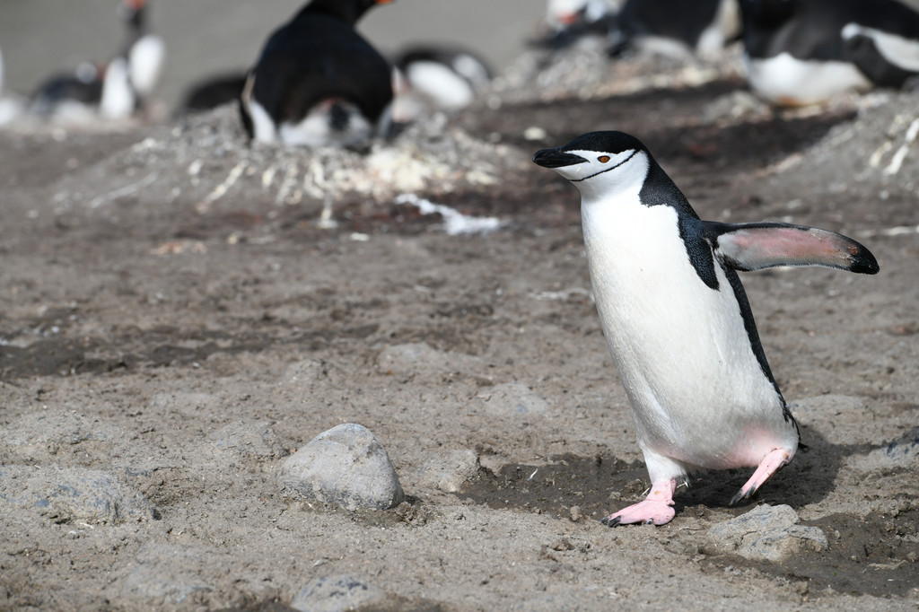 该岛面积不大,两座小山披挂着皑皑白雪,坦露的地表长有少量的苔癣和地衣,这是南极唯一可以看到的绿色。这里是帽带企鹅和金图企鹅栖息地,帽带企鹅白色的腹部,油黑的背部,从黑黑的嘴巴下方,到头上的两侧,长有一条黑黑的一条细毛,像似头上带有一个小帽子,黑黑的斗鸡眼里长着一对橙色的眼珠,让人越看越喜欢。金图企鹅腹、背部的染色和帽带企鹅相同,不同的是橙色的嘴巴,橙色的双脚,和头上长有一块雪白的白毛,表情和走路显得非常伸士。企鹅根本不怕游人,常常摇摇晃晃地走到你的面前看看,转身又走向别处。