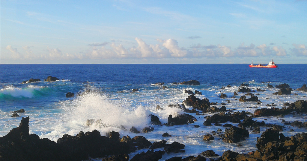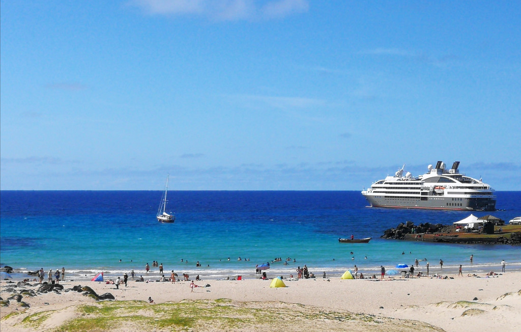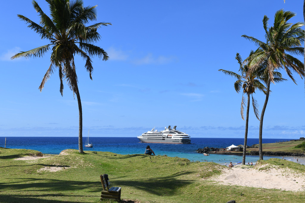 下一站,我们来到了复活节岛最美丽的地方~阿纳凯海滩,他有着壮美的海岸线,一片白色的沙滩,沙子特别柔软,光脚踩上去很舒服,岸上的棕榈树,青翠茂密,海水清澈湛蓝,没有一点污染,远处一艘漂亮的游船,静静地停泊在海湾里,近处两艘快艇,在大海里飞驰,践起一道道浪花。离沙 滩不到百米处,著名的“七武士”巨大摩艾耸立在这里,是岛上保存最完好的摩艾石像群,最大特点是摩艾都带着红色的帽子,它们就像守卫在海防线上的勇士,雄壮威武。