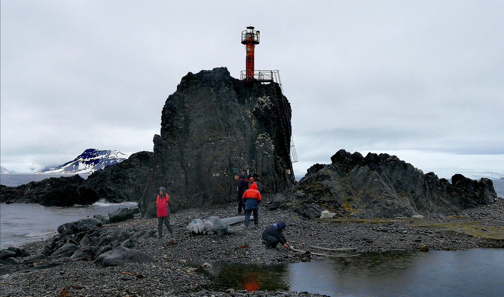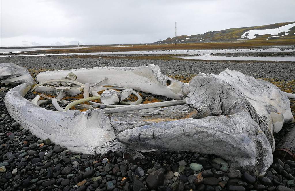 邮完明信片来到外面,欣赏岛上美景,房前不远处,有一套完整的鲸鱼骨架,骨架巨大,有20多米长。这里有帽带、金图和阿德利企鹅,岛的远处耸立着一座高高的灯塔,在灯塔的后面,面朝大海,耸立着一尊圣母玛利亚的雕像,宗教无国界,好似圣母玛利亚为生活在这里的各国科考队员祈祷着平安、快乐,为南极大陆祈祷着和平、安宁和永久的纯静。