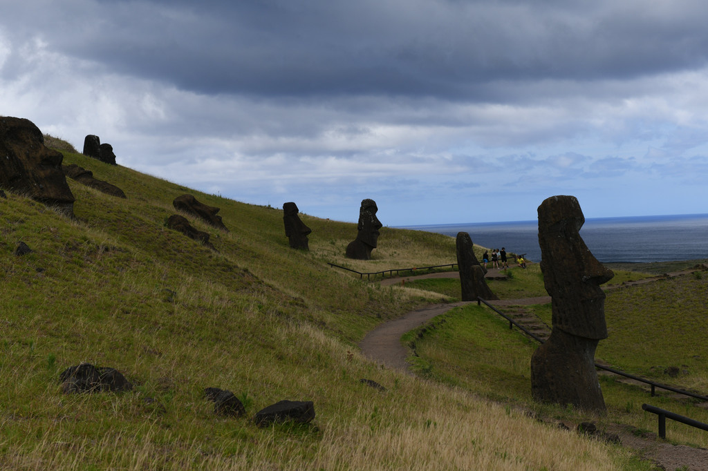 我们首先来到了拉诺拉拉库采石场,这里是石料开采和雕塑石像的地方,摩艾在这里雕塑完成,运到岛上各处,在这里的山坡上,散落着400多尊未完成和完好的石像,全岛最大的一尊摩艾就在这里,高12米,重200吨。山坡有一个观景台,可以俯视广阔的西太平洋。