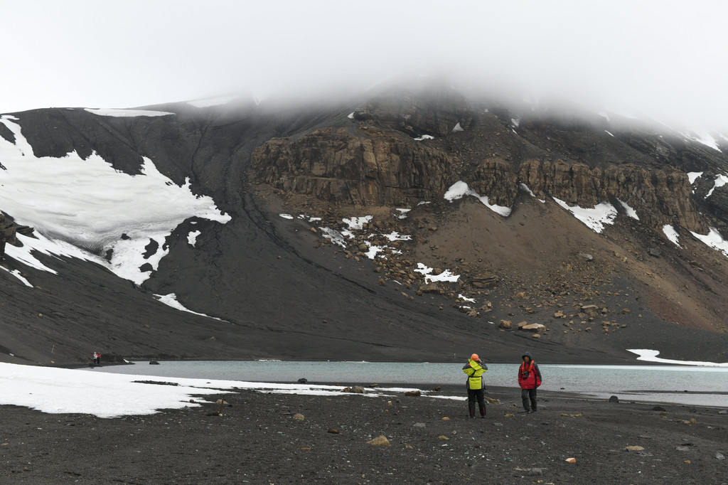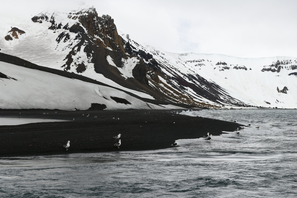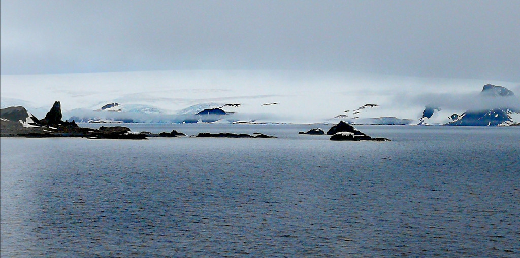 今天是在南极的最后一天,清晨广播通知乌斯怀亚号即将穿过狭窄的海神王水道,大家赶紧登上甲板,目睹这惊险的时刻,水道非常狭窄,行船非常困难,稍有不慎,船只就要撞到两边的山峰,好在乌斯怀亚号顺利行驶过去,到达欺骗岛。欺骗岛是一座火山口形成的一个独特岛屿,四周全是高山,里面的火山口被海水淹没,只有这条狭窄的水道才能进入。欺骗岛是南极的一座休眠状态的活火山,上世纪60年代末,欺骗岛火山喷发,顷刻间摧毁了岛上所有建筑,好在事发前阿根廷发出了预告,才避免了人员伤亡。岛上由黑色火山岩构成,一片慌凉,一片宁静,只有生活在这里的帽带企鹅和大量的海鸟,才给这里带来了丝丝活力。