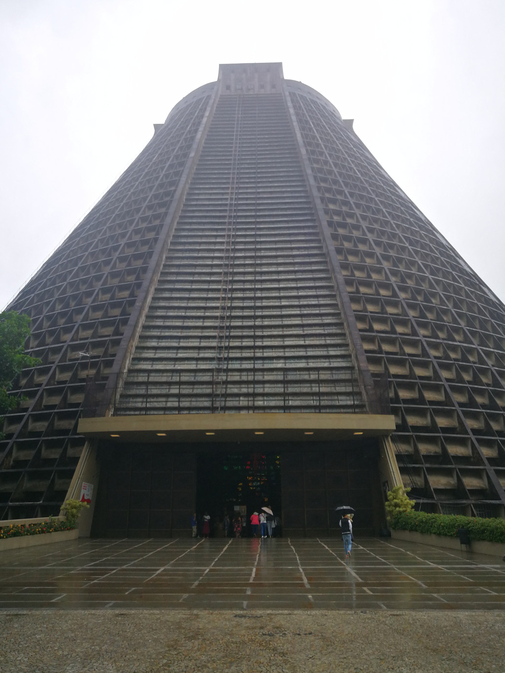 午餐后,我们先游览参观了里约大教堂。该教堂1976年建成,是一处钢筋水泥结构的现代化建筑,呈圆锥形,高75米,底部直径106米,好像天梯,所以又称天梯教堂。
