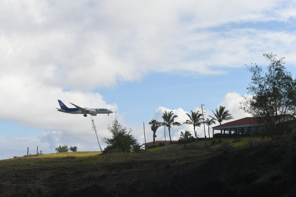 又起了一个大早,7点多钟赶到机场,乘坐智利航空LA841航班飞往复活节岛。圣地亚哥飞往复活节岛,每天只有上午一趟航班,所以,此航线的机票十分紧张,3700公里航程,飞行5个小时,下午14点飞抵目的地。一出机场,当地导游为每一位游客献上花环,以示欢迎。大家上车,开始了复活节岛之旅。