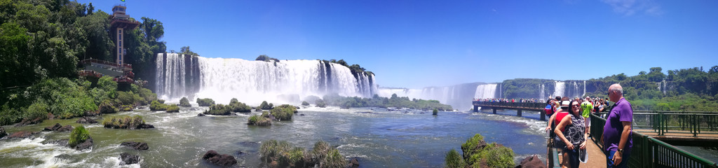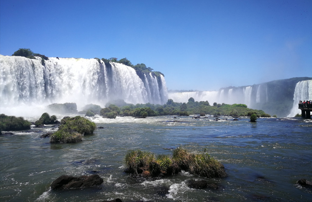 从入口处进入,沿一条栈道一路走下去,有众多观赏地点,在不同的地点,不同的高度,不同的角度,你会看到不一样的壮观景象,徘徊于山水之间,饱揽大自然的绝美风光,令人终身难忘。瀑布群是一幅壮美的天然画卷,位于正中间的是最壮观的“魔鬼的咽喉",站在瀑布下面的栈桥上仰头上望,滔滔河水仿佛从天际奔腾而来,先跌落到石阶之上,继而冲向“魔鬼咽喉“82米下的深渊。发出震耳欲聋的轰鸣巨响,令人惊心动魄。 站在气势磅礴的瀑布面前,瀑布与水雾将阳光折射成一道道美丽的彩虹,让人不禁赞叹大自然创造出如此神奇的景观。栈桥被水雾所宠罩,水花飞溅,如同细雨般打在人们的身上和脸上,让人笑在心中,喜在脸上。整个大瀑布的游览用时三个多小时。
