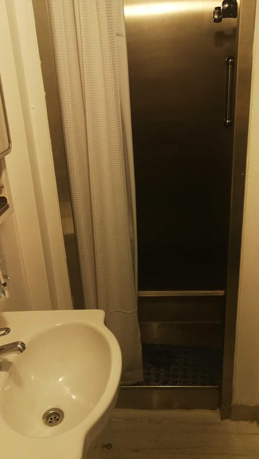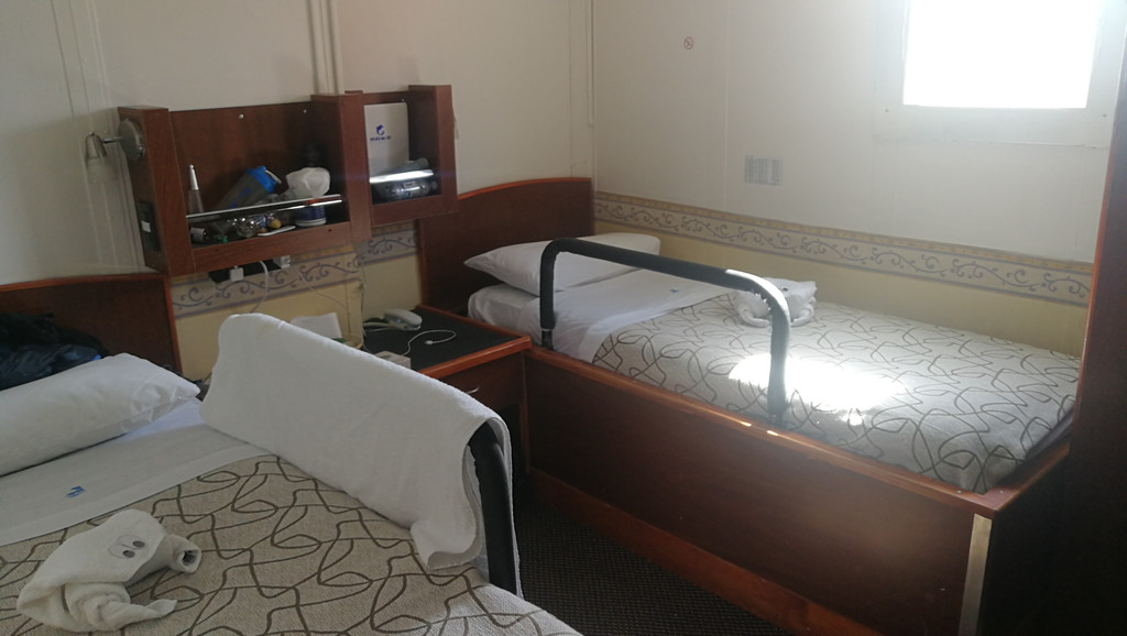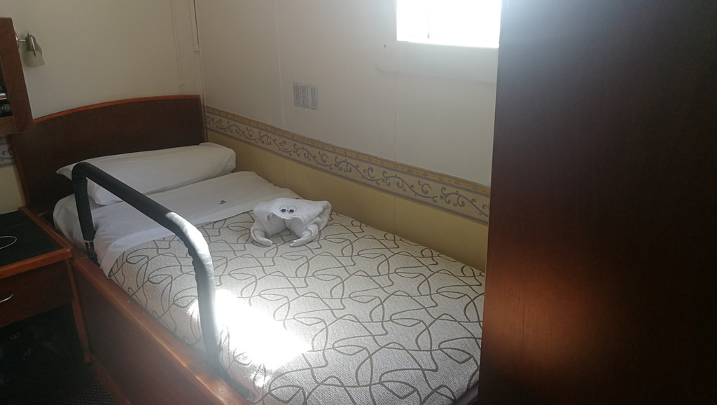 下午4点钟我们来到港口码头,每人一个标识牌,挂到自己的行李箱上,由船舱服务员送到房间。我和同屋的上海何兄住在B舱423房间,两张单人床,一个床头柜,一个大衣柜,独立卫浴,房间带有窗户,条件相当可以,令人满意。