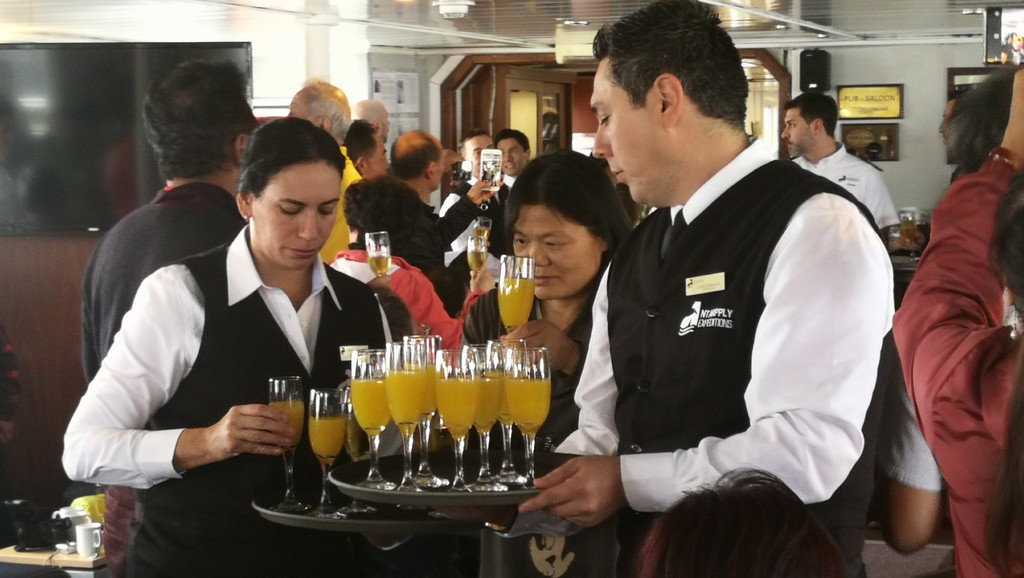 开船半小时后,船长携大副、探险队长、行政经理及部分船员,举行了欢迎酒会,船长首先致热情扬溢的欢迎词,欢迎客人的到来,并介绍了各个部门负责人。随后,行政经理介绍了船上的自然情况、客人需知及船上要求,最后进行了安全演习。