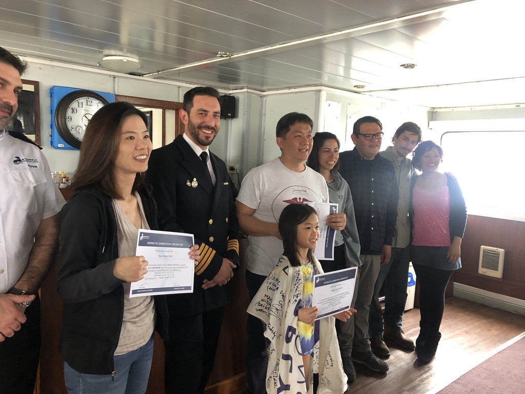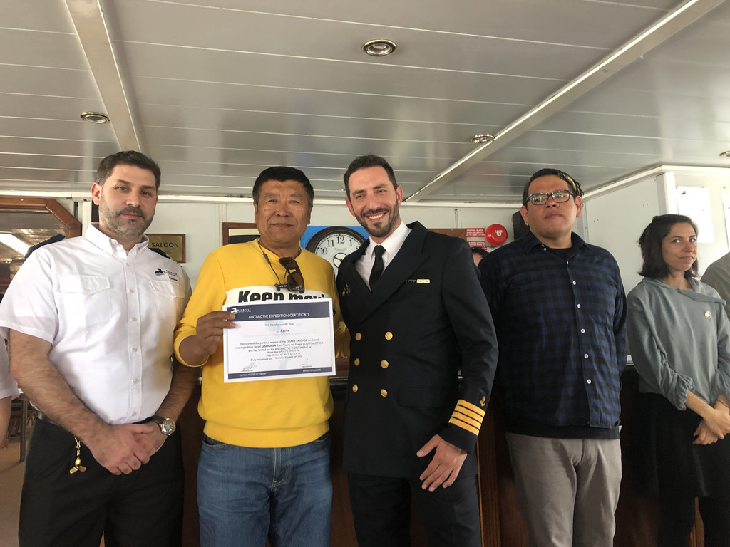 接近尾声时,激动人心的一目出现了,船长将一面由乌斯怀亚号全体船员签名的乌斯怀亚号船旗,频发给全船年龄最小的团员,一位6、7岁的小姑娘留作纪念,这一举动将仪式推向了高潮,掌声不断,欢呼声不断,献给幸运的小姑娘,热心周到的乌斯怀亚号。