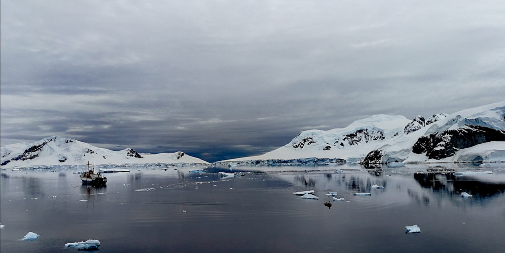 今天起的很早,来到甲板上,感觉乌斯怀亚号行驶的特别平稳,原来船已经驶进了南极半岛的天堂湾,这里风平浪静,四周雪山环抱,碧蓝的天空,清澈的海水,白雪皑皑的雪山,黑、白、兰三色交相辉映,组成了一幅水墨丹青画,非常壮美,非常诱人。