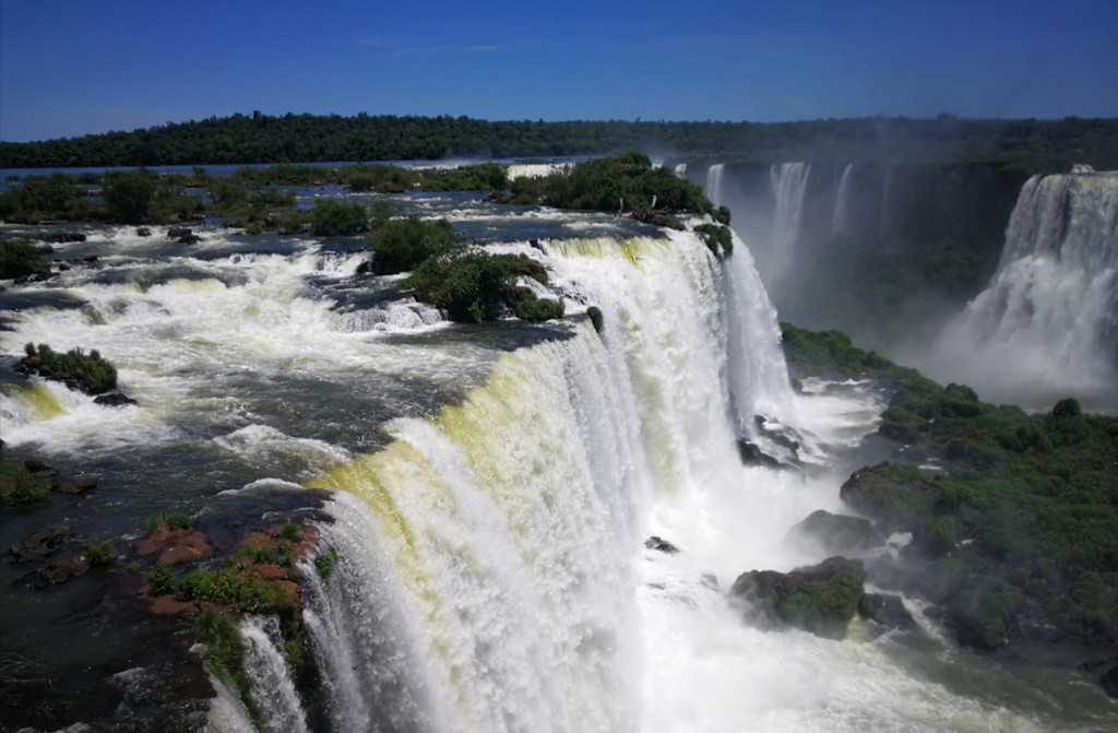 伊瓜苏大瀑布是世界上最宽的瀑布,位于巴西和阿根廷交界处,3/4在阿根廷境内,1/4在巴西境内。马蹄型瀑布由275个瀑布组成,最大瀑布跌水90米,流量1500立方米秒,被称为“魔鬼之喉"。伊泰普水电站是世界第二大的水电站,泄洪道最大泄洪能力每秒62万立方米,相当于40个伊瓜苏瀑布的流水量。