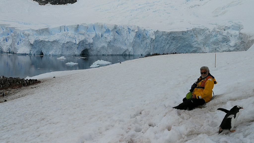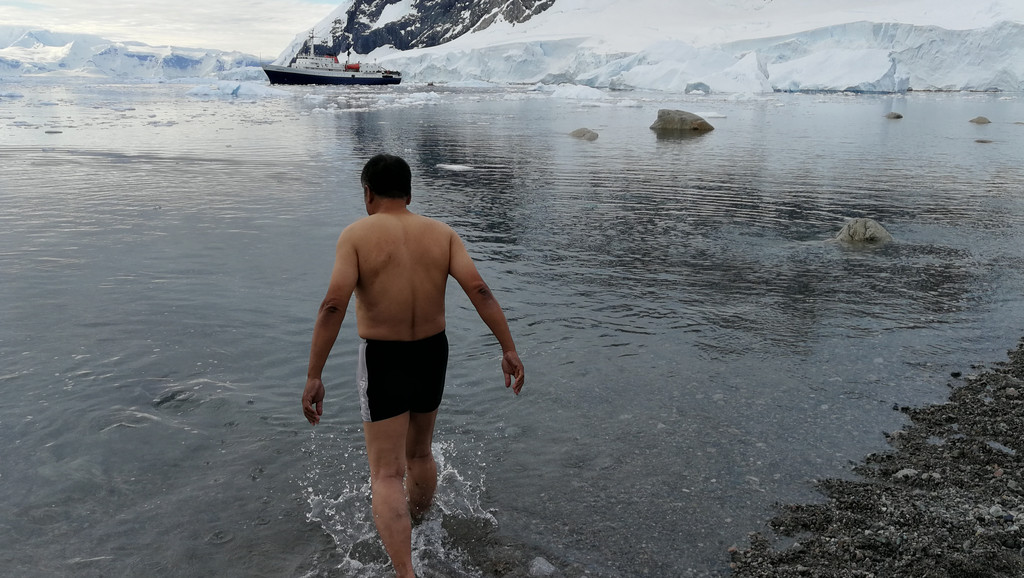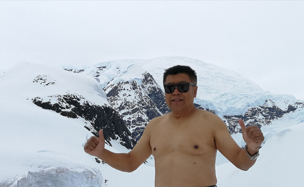 此岛建有阿根廷布朗科考站,但已废弁多年。由于天气睛朗,又没有风,兴奋的人们有的脱掉外衣,只穿短袖在雪中拍照,女士换上裙子在雪中漫步,男人更是赤裸上身,显示他们的力量。疯了,大家都玩疯了,有的在山上滑下来,有的在雪地里像企鹅一样 匍匐前进,有的用雪擦身,还有的在雪里奔跑。所有人都在放飞自我,享受这美好时刻。