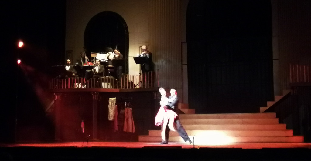 晚上来到TangoPorteno,这是一个历史悠久的剧场,是一个边吃晚餐,边观赏探弋舞表演的地方。晚餐在表演之前,红、白葡萄酒,各种饮料随便饮用,前菜是甜点,主菜是牛排。牛排超大超厚,足有一斤重,看着很厚,怕咬不动,结果用餐刀砌开,里面还带有血丝,一口吃下去,香,又嫩又香,完全让人意想不到,在观看表演的剧场里,还有如此好吃的牛排。当晚餐将要结束时,表演开始了。