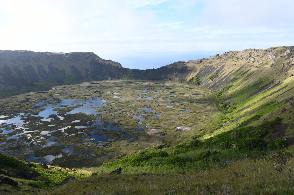 今天早晨第一次不赶飞机,到餐厅面望大海,吃了一顿丰盛的早餐。早餐后继续在岛上游玩,首先造访了拉诺廓火山口。复活节岛是一座火山喷发形成的海岛,而拉诺廓就是这坐岛屿的火山口。火山口很平坦,形成了一个火山湖,湖内生长着各种奇异的水植物。