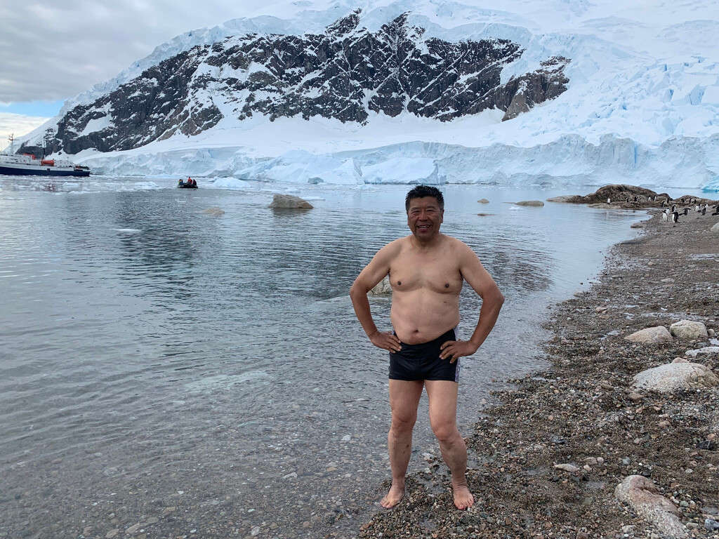 岛上活动结束后,我们来到海边,进行今天最刺激的冰泳活动,天气给力,气温5~6度,有30多人先后跳入冰冷的海水里,挑战自我,体验冰泳的快感。我是一个喜欢刺激冒险的人,当然不能错过这一难得的机会,脱掉外衣,跳入海中,向大海深处游去。