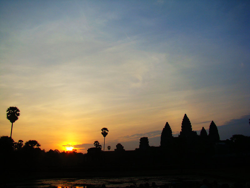 1,早上5点出发,前往小吴哥(Angkor Wat,五个玉米头)莲花池前看日出,这天日出时间大约6:10AM。从西门进。
