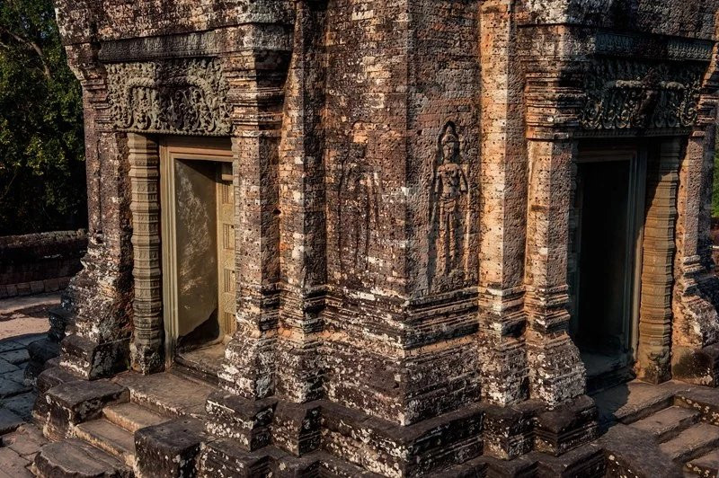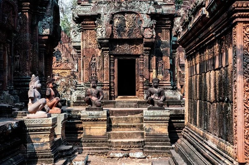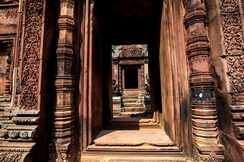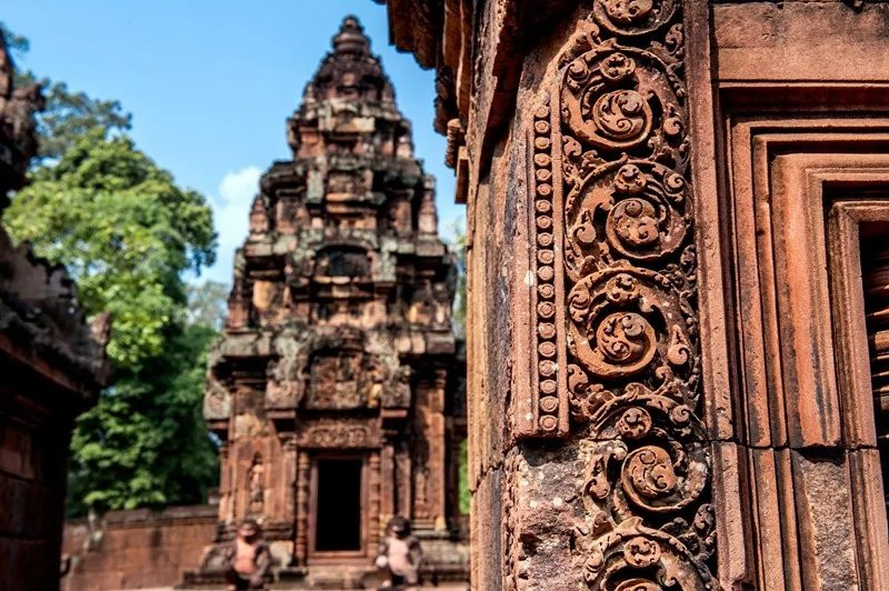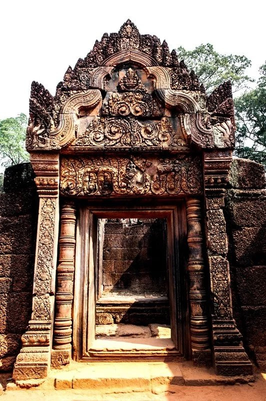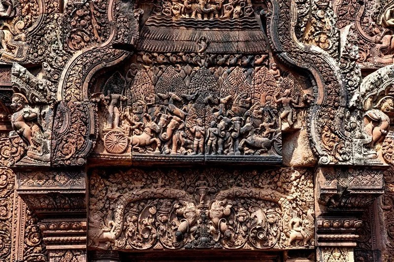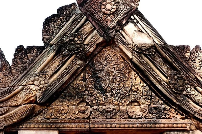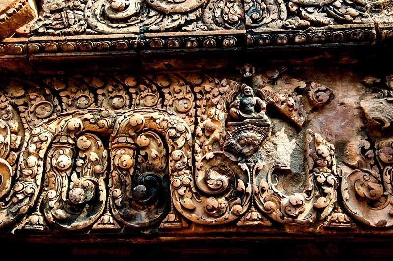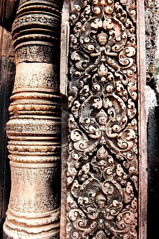 这种繁复的雕工,使人忘了这是在砂岩上的雕刻,这是织锦,是一根一根细致纤维的穿梭编织,吴哥王朝的工匠却在坚硬的石头上完成了。