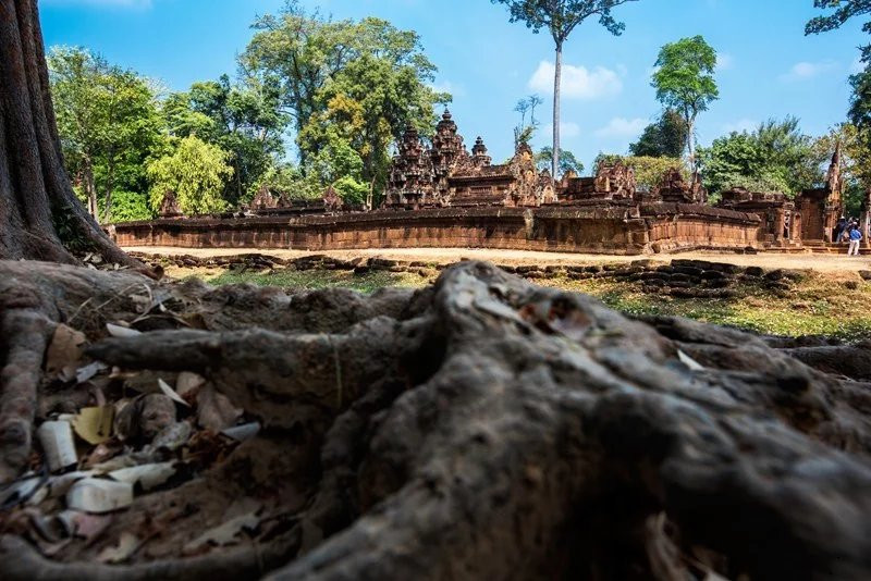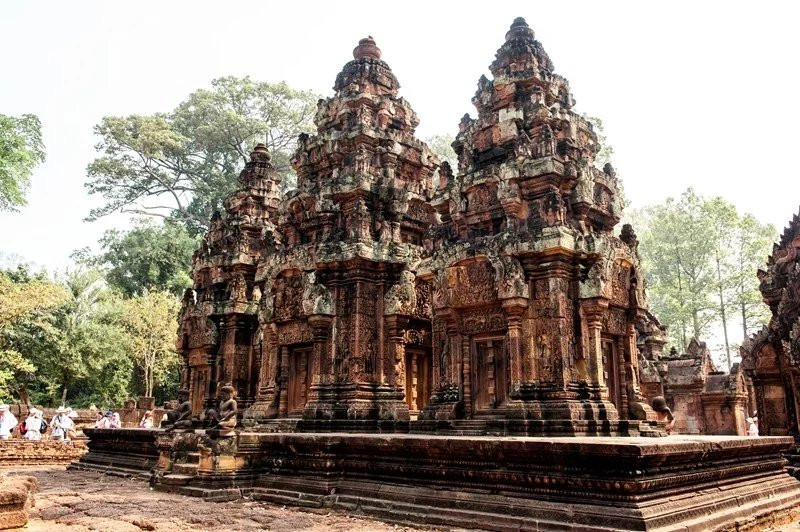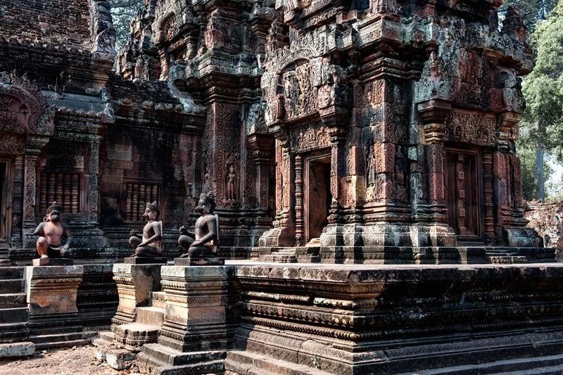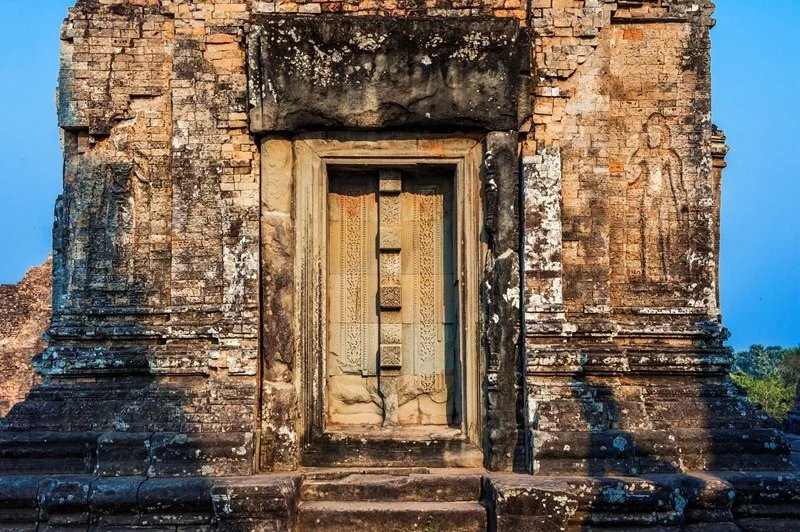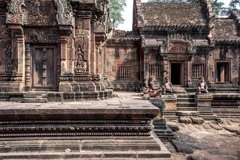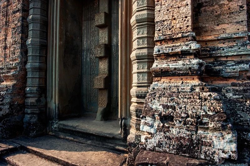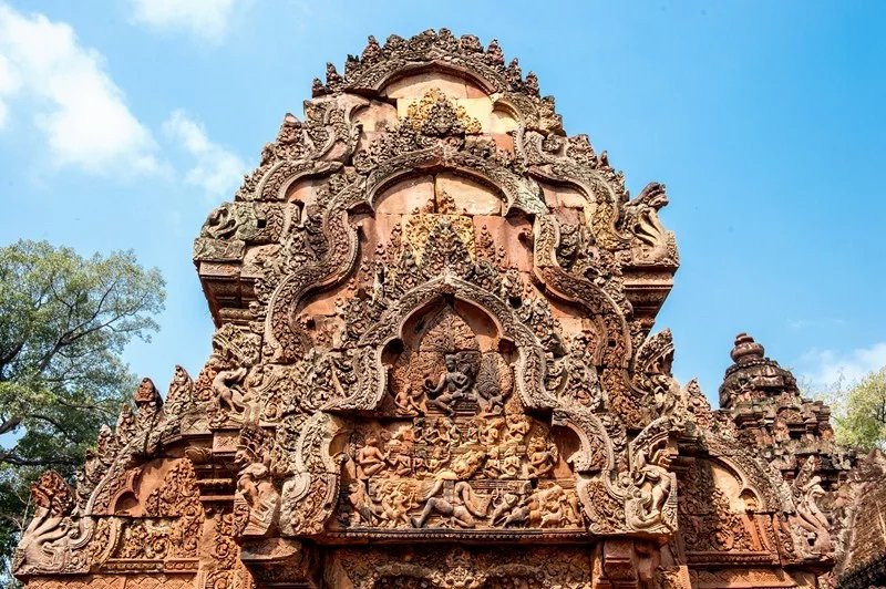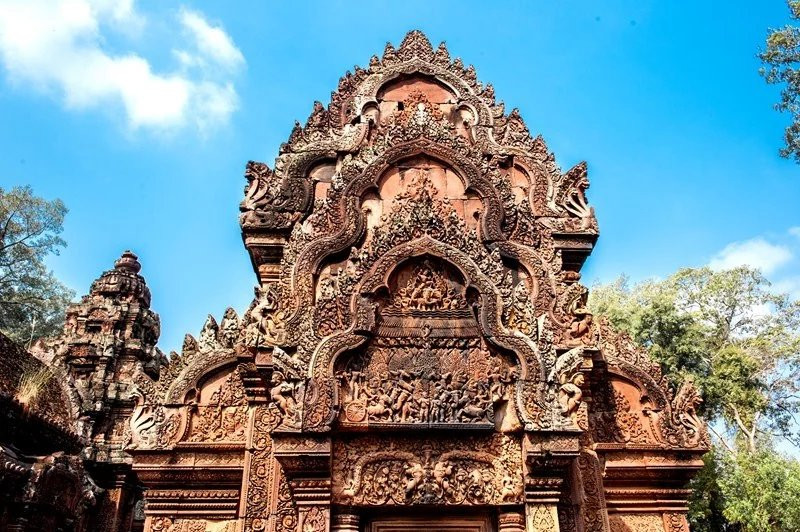 这种繁复的雕工,使人忘了这是在砂岩上的雕刻,这是织锦,是一根一根细致纤维的穿梭编织,吴哥王朝的工匠却在坚硬的石头上完成了。