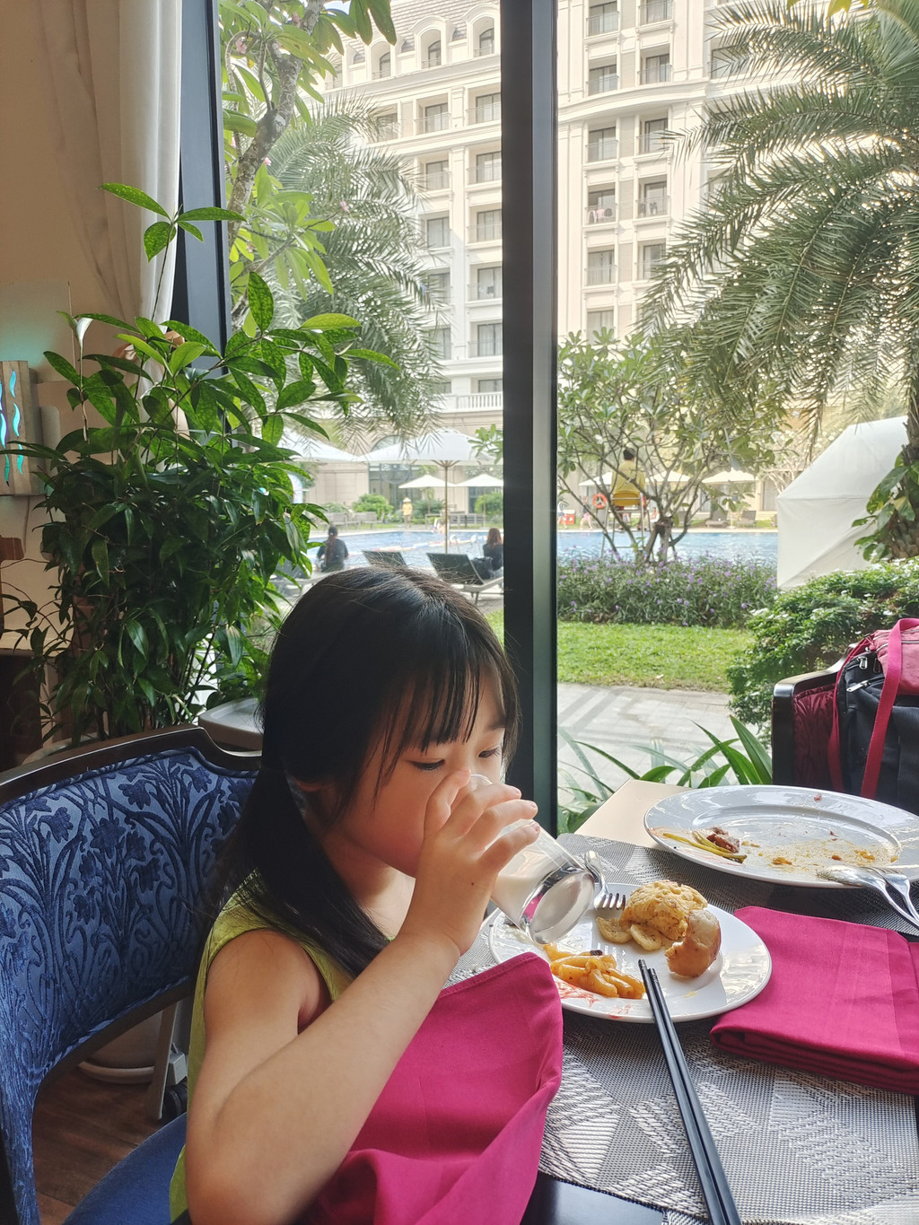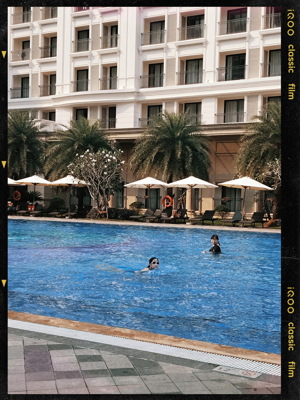 酒店游泳池比较小,但是无边泳池,可以拍照打卡,这个泳池差点让我们出了意外,泳池里面好多阶梯,我带着女儿下去泳衣,她站池里也就60厘米深的地方,我眼神离开10秒,就发现我女儿不见了,泳池里看到我女儿头上戴的黄帽子。叫旁边一个老外给她捞出来了,就是因为突然出现的台阶,我女儿一下踩空掉到1.5米的池里了,一点过渡都没有,而且边缘也不清晰,没有救生衣,这个泳池堪比死亡泳池。