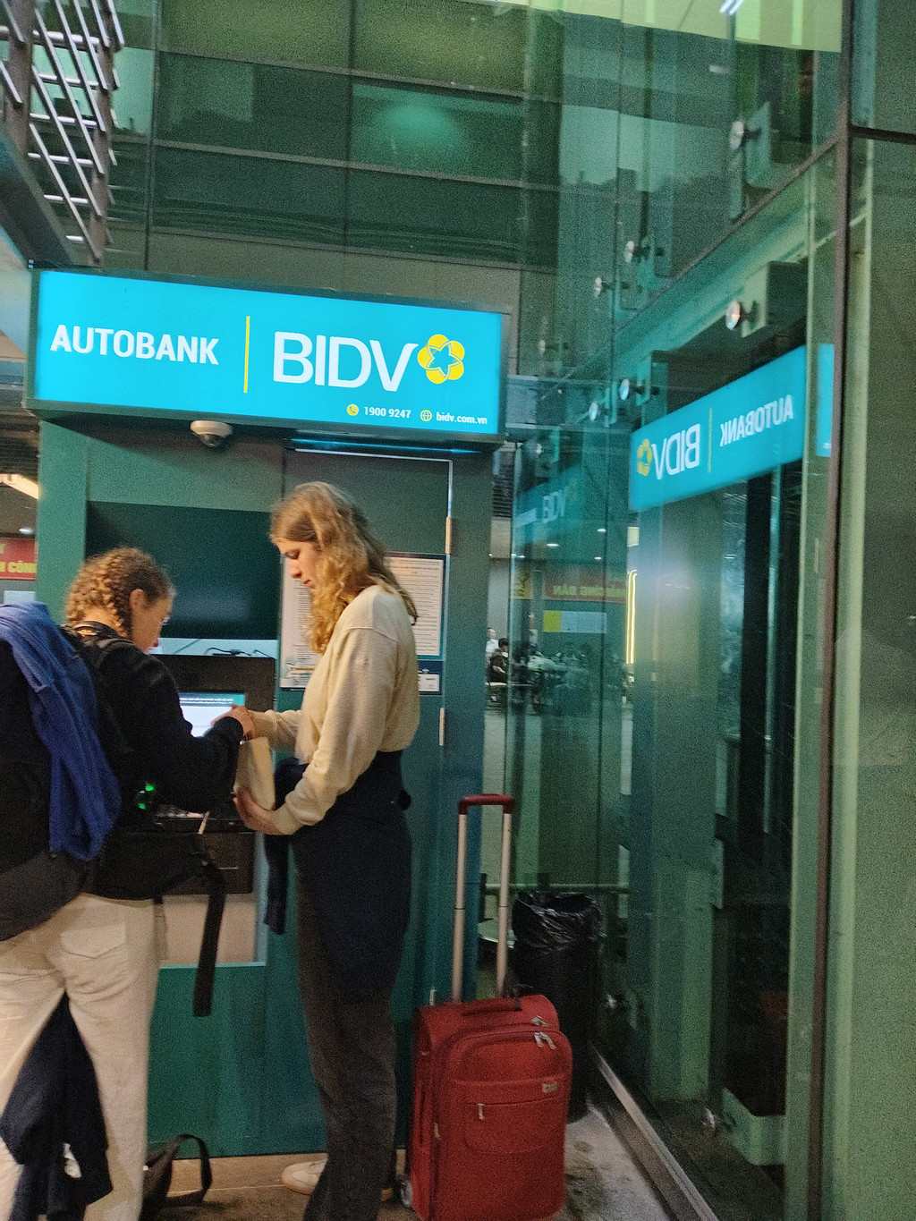 越南盾国内不太容易换,所以出机场先取钱,右转电梯下有ATM机,只要有银联标志的,都可以取钱,打算先取900万,结果输的时候少输一个0,变成90万,以为出来一大堆钱,结果才3张,被自己蠢哭。ATM取现一笔最高300万。