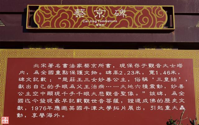 蔡京碑高2.23米,宽1.46米,共刻有楷书49行。 《大悲菩萨传》碑文,依据道宣天人对话,讲述楚庄王之女妙善铁心向佛,苦心励志,舍身救父,最终涅槃为千手观音的宿世因缘。