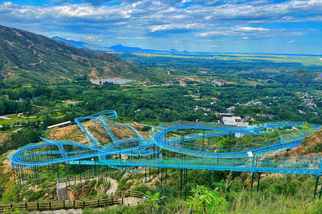 3、景区推荐游玩路线:入园第一站可以去体验我们刺激的七彩滑草(建议购买观光车票20元/张,随走随停),距离入园口300米左右,乘坐观光车到麒麟山脚下坐索道上山,山顶游玩虎不敢玻璃吊桥,欣赏太行美色!下山乘坐800米长的地溜(山间大滑梯),到半山腰下山步行15分钟到20分钟,到达黄金本寨,乘坐观光车到黄金寨山,坐上懒人神器——龙啸电轨车,到达半山腰,乘坐悬壁火车,穿山越谷,欣赏美景,到达管式滑道,乘坐管式滑道下山,结束我们一天的游玩时光~