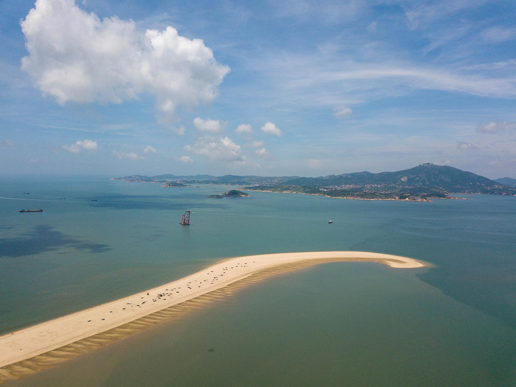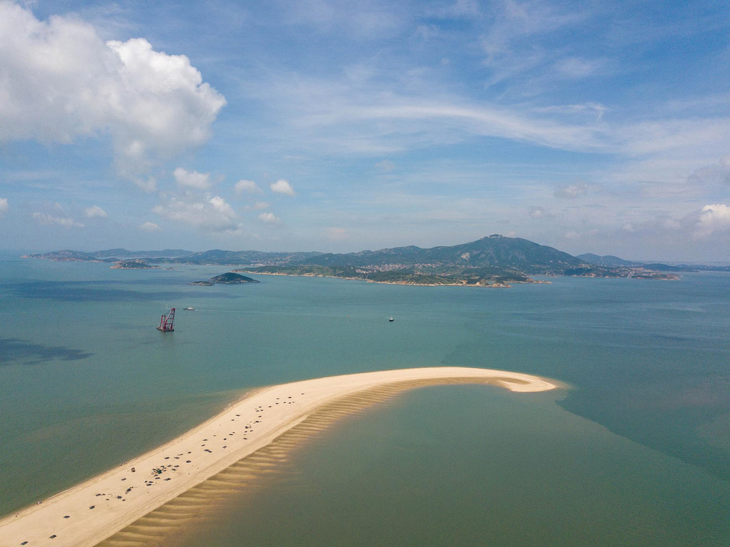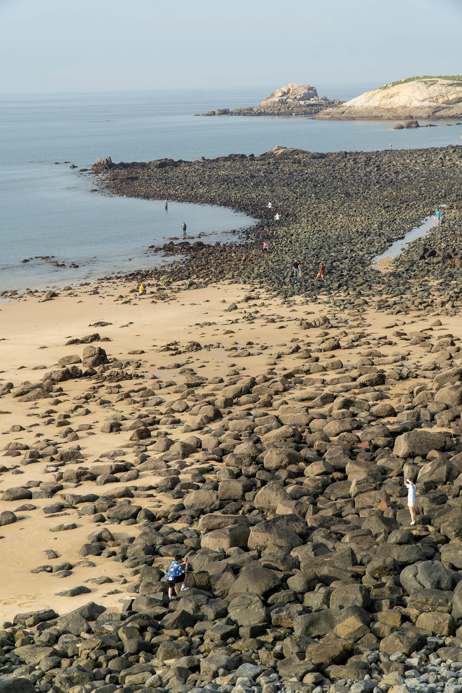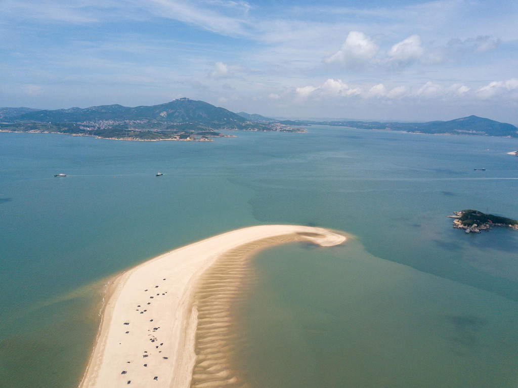 在不同的时段前往,能看到不同景致的象鼻湾。尤其是在涨潮时,沙滩被雕塑成“象鼻”,浮现在海面上,航拍视角下是天空之境般的大片既视感,就像行走在画里一样。退潮时,可以在沙滩山挖贝壳或是抓小螃蟹。