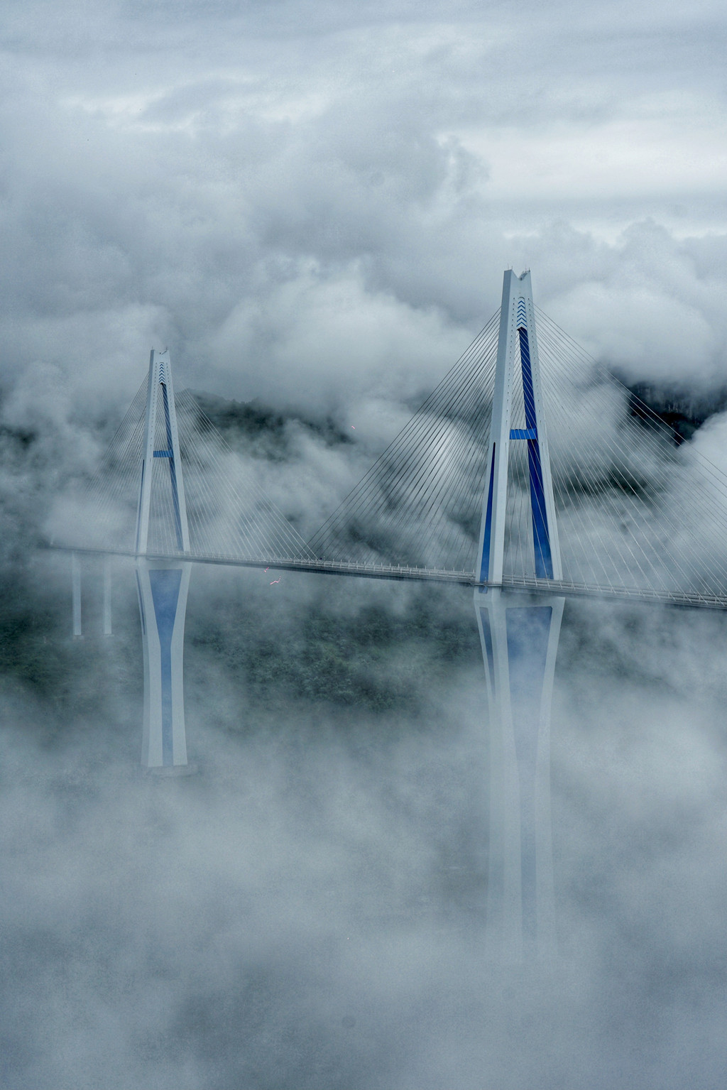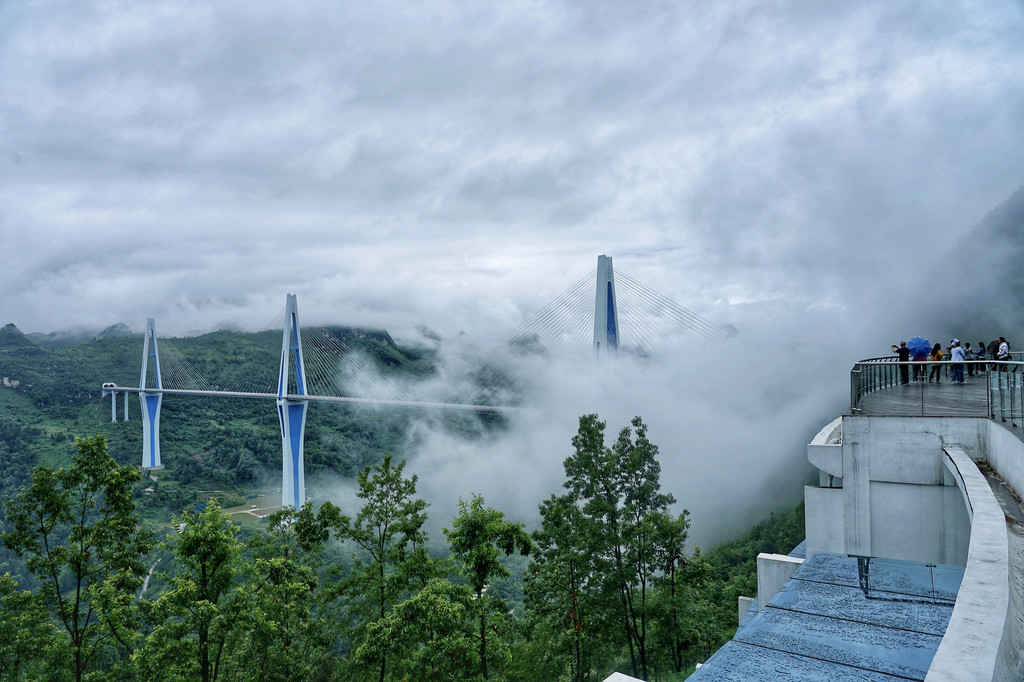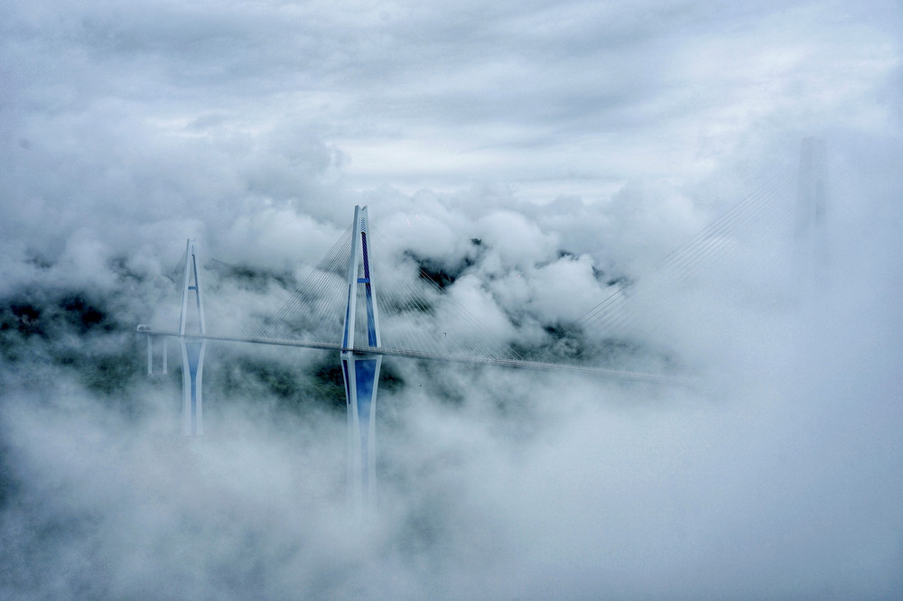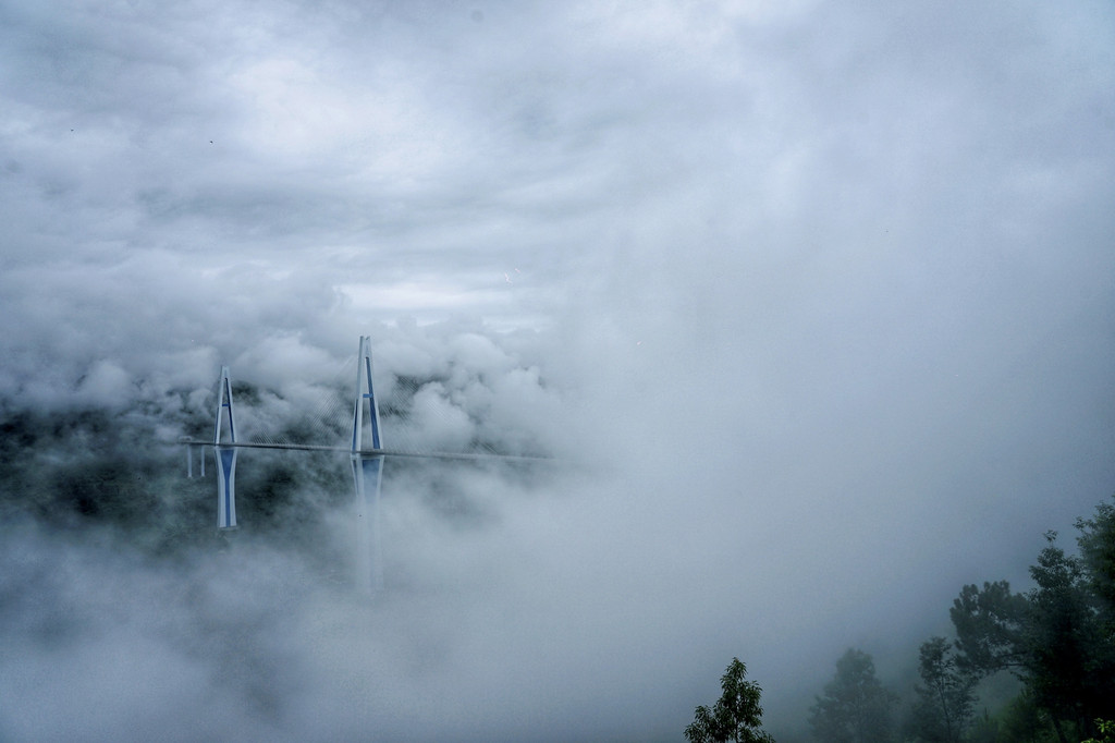 据说山谷中时常云雾缭绕,我也非常好奇那是怎样的景观。当我亲眼看到之后,我终于明白了“天空之桥”的真正含义。这里的空气湿度很大,这令大桥总是隐藏在白色的云雾之中,一阵风吹过,才能隐约看到巍峨耸立的桥塔,乍一看真会以为是凭空出现的。
