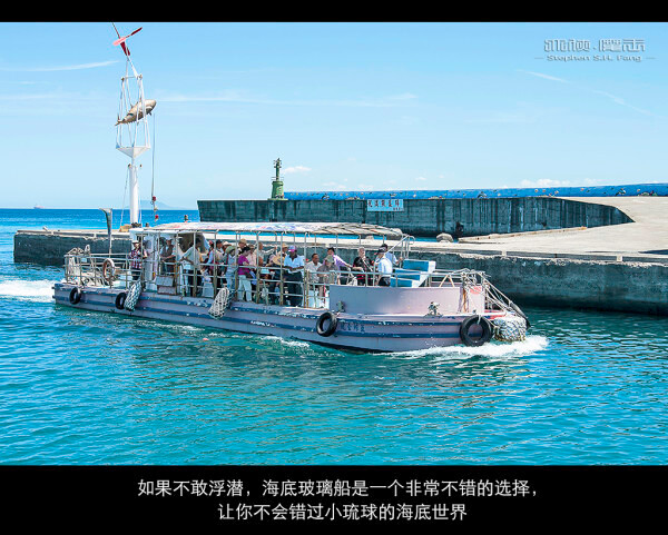 这个是“海底观光玻璃船”的一种,小琉球的这一种是船身有一半在水里面,所以又叫“半潜艇”,船舱底层有透明玻璃,全票是260元台币,载你到小琉球外海看海底世界,航程大约30分钟,运气好可以看到海龟,对于不想浮潜的人是一个不错的选择。