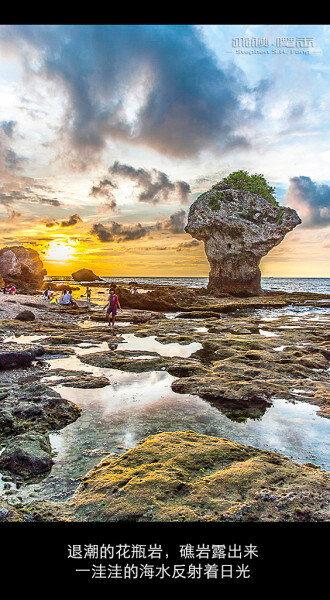 海水退潮了,珊瑚礁岩形成一洼洼的小水塘,水塘里面的海水映射着夕阳光与天空的云彩,构成一幅“光影珊瑚海”的美景,这样的景色,还能有什么奢求?