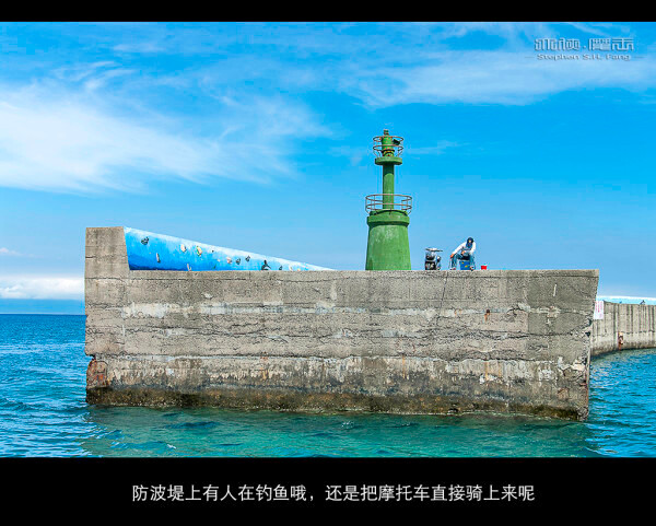 仔细看,防波堤上面居然有人在钓鱼!不知道这里能钓到什么。