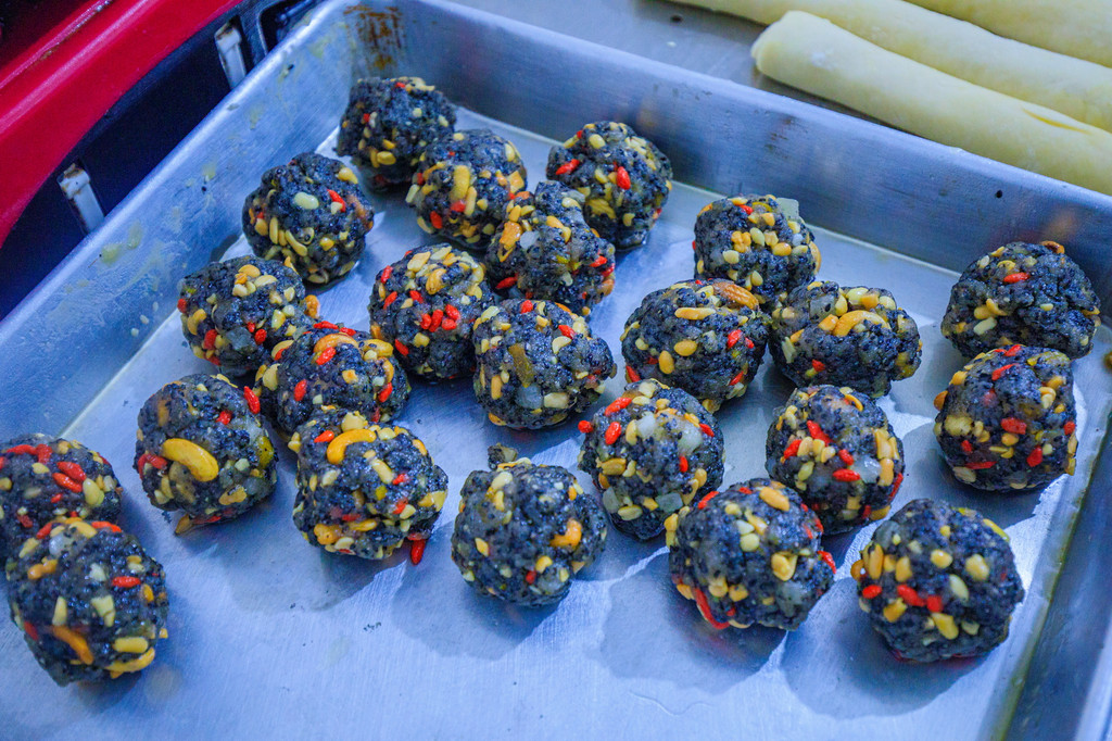 作为“老月饼”,里面的馅料自然也有“老下数”——花生米、冬瓜糖、冰糖、金桔丁、黑芝麻、枸杞、瓜子仁……所有的食材都需要先烤熟或者用油炸熟以后,才和在一起。除了做传统的糖馅,也会根据客人的需求,在馅料里面添加鲜肉、核桃等食材。