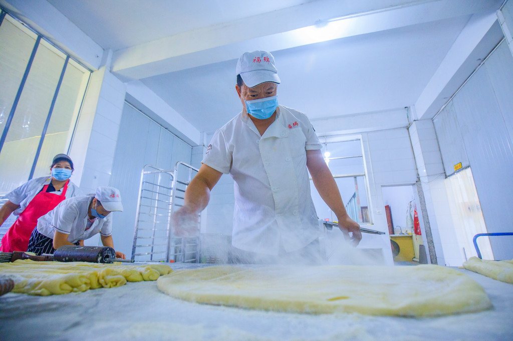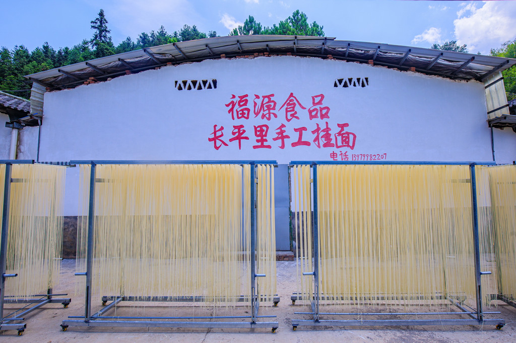 走进位于长平乡福寿村一个小山坡上的福源食品厂,只见一排排架子上挂满细细长长的面条。员工们正在忙着拉面、晾面,忙个不停。