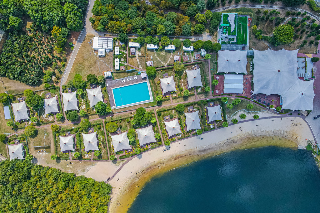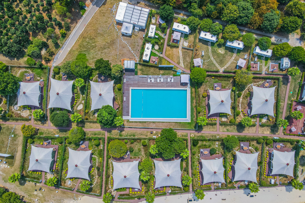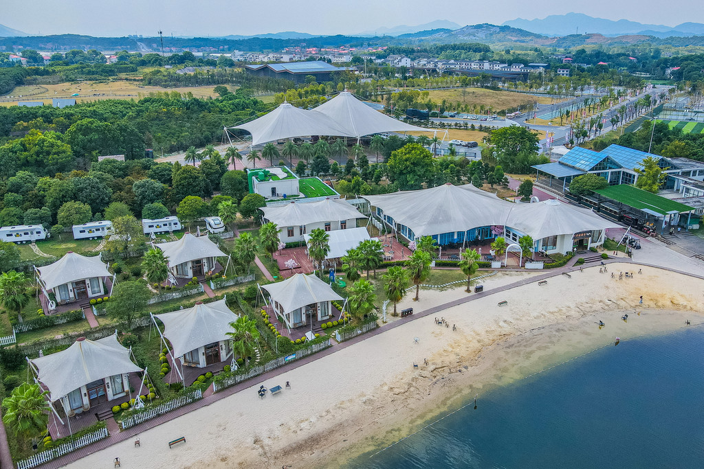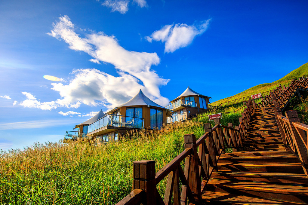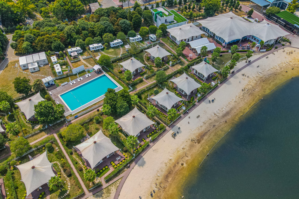 酒店分布于沙湖湾西南侧,酒店设计以帐篷为顶,独门独户采用木篱笆围绕,尽享私密空间,落地玻璃全采光设计,每间酒店都是面向湖,居住其中仿佛置身森林海景房,看星空皓月,闻虫鸟争鸣,拥抱大自然。精配品质家装,星级酒店服务规格。