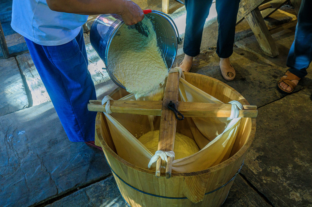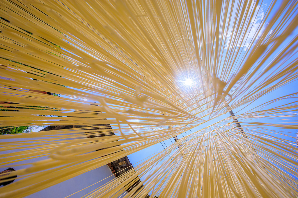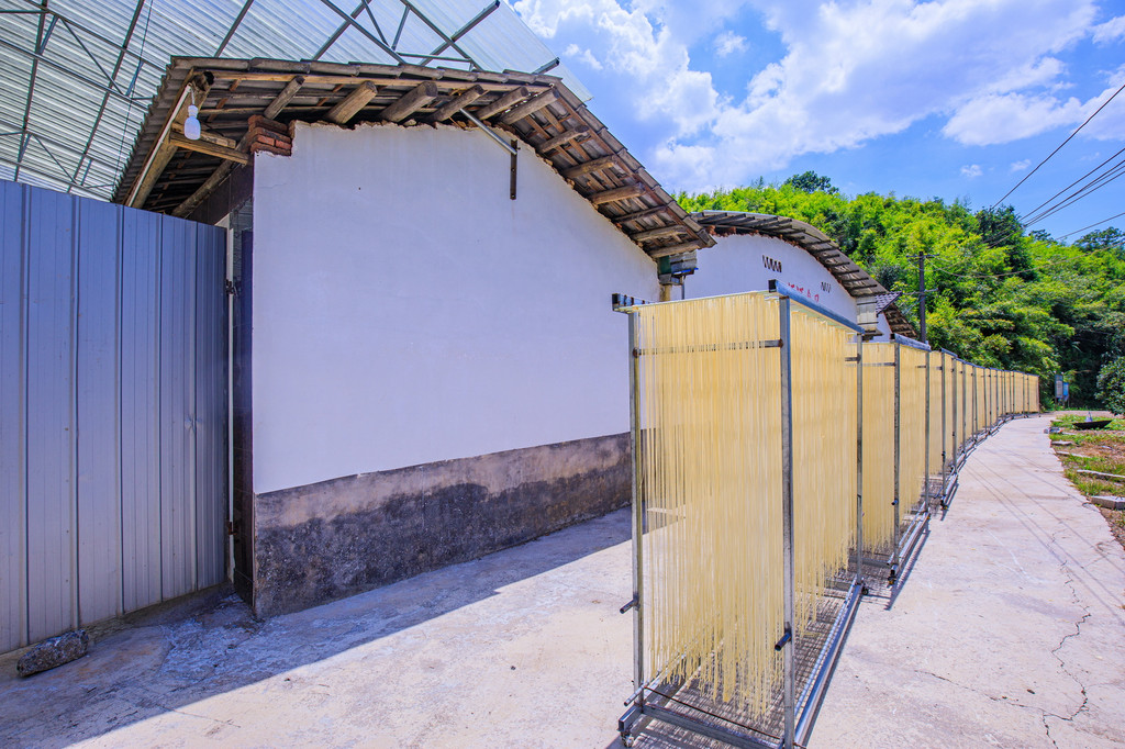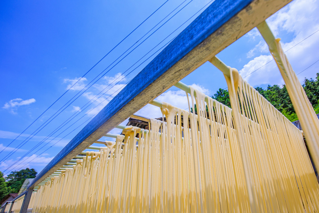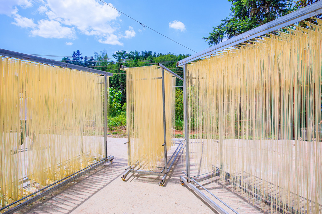 村民置身于轻盈如流水的线条间担杆晒面,形成一道独特的风景。手工加工挂面前后要经过十几道工序:从头天开始,就要磨面、和面、发酵,到第二天凌晨3时起来搓条、盘条、上面筷、挂面、拉面、晒面、叠面等。