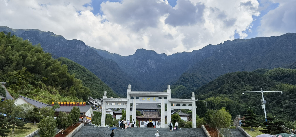 山门牌坊,正中“武功山”三字由范曾题写。正面楹联: