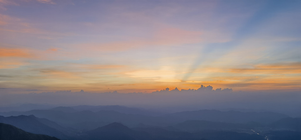 空中霞光四射,远处山峦起伏,大地沉静在一片薄薄的云雾之中。