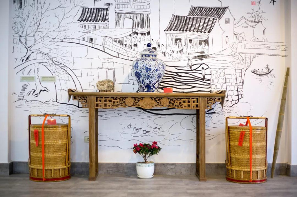 一副喧闹的村镇市井生活水墨图跃入眼帘竹编扁担、雕花木桌的端庄放置