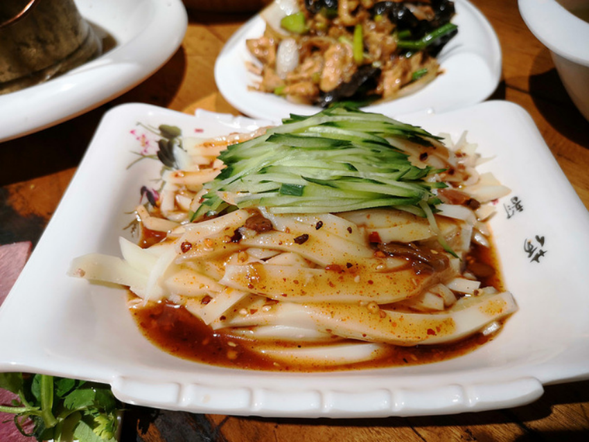 之前看到有人这样形容这道菜,“色白如雪光润如脂、柔韧筋劲、回味绵长。面皮弹软,配以酱油、香醋、味精等调料,味道酸、辣、筋、爽、凉,别有一番风味。