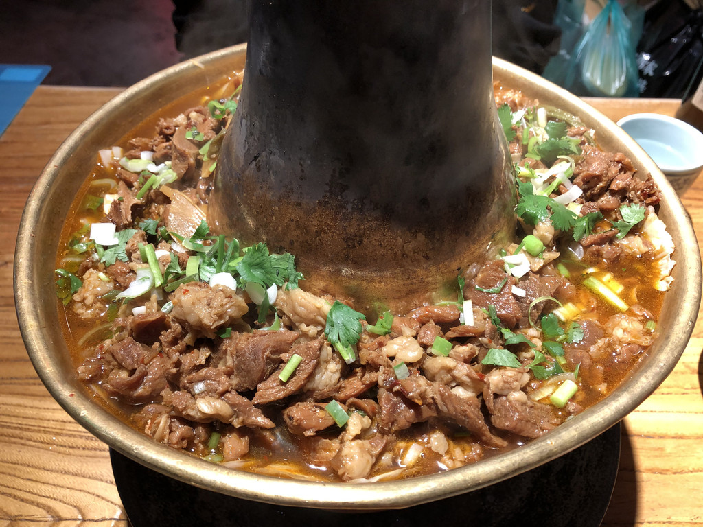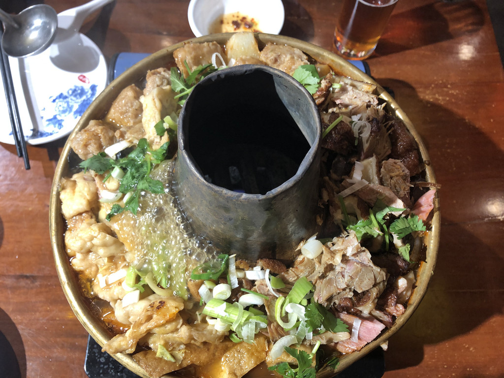 聚宏源公馆位于古城南大街,也就是最繁华的明清街,公馆是四合院,前院是用餐的地方,后院是住宿,很安静。晚餐不想去别的地方找,就在公馆里吃的,点的铜锅杂烩,一般般。